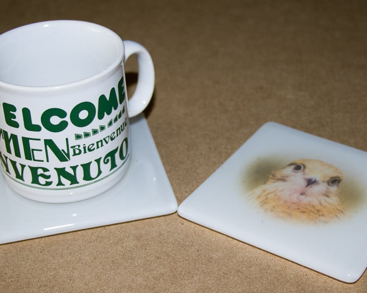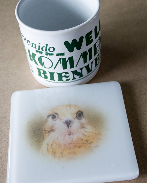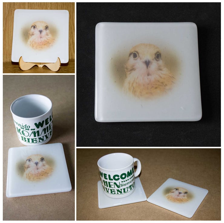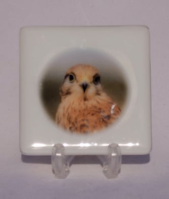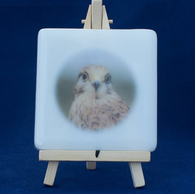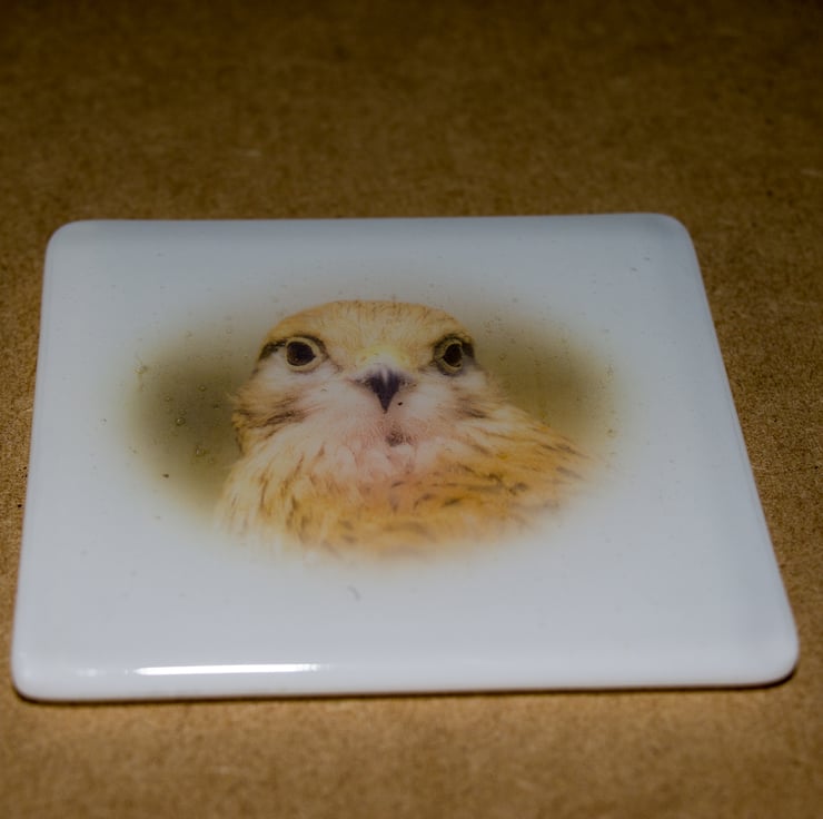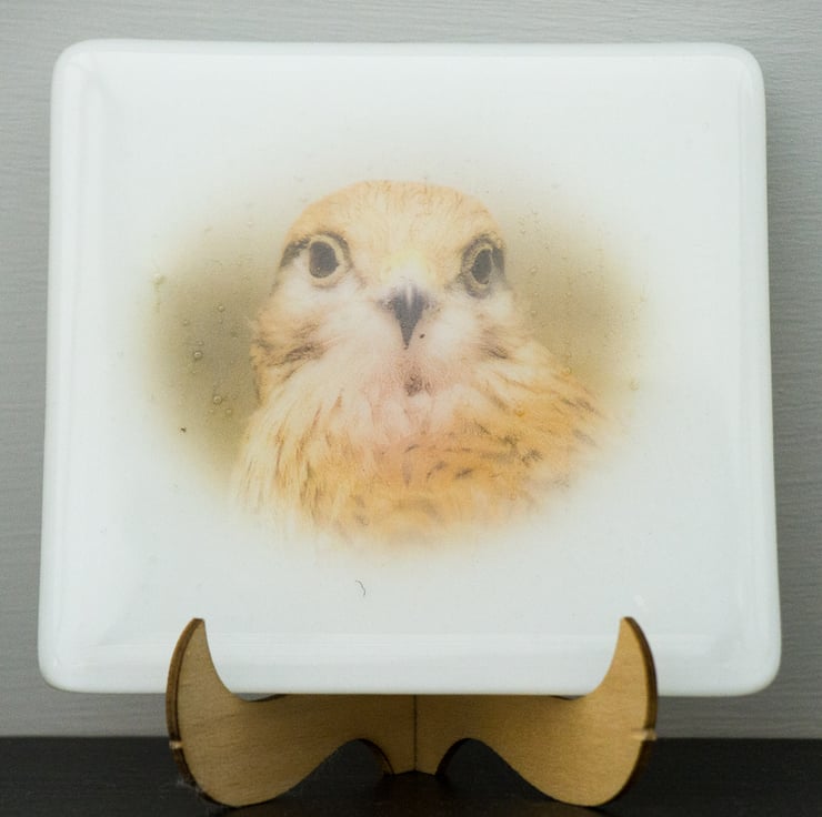 This 10 cm square coaster, made from fused glass, features a photograph of Whisper the Kestrel.