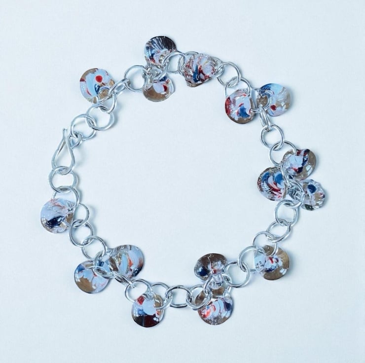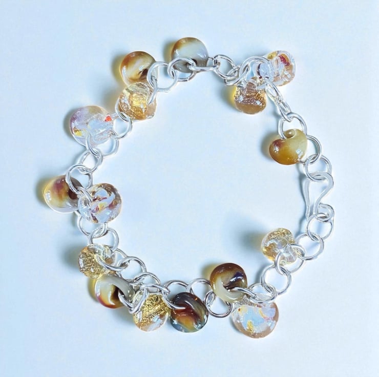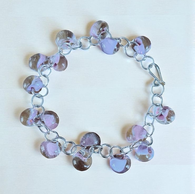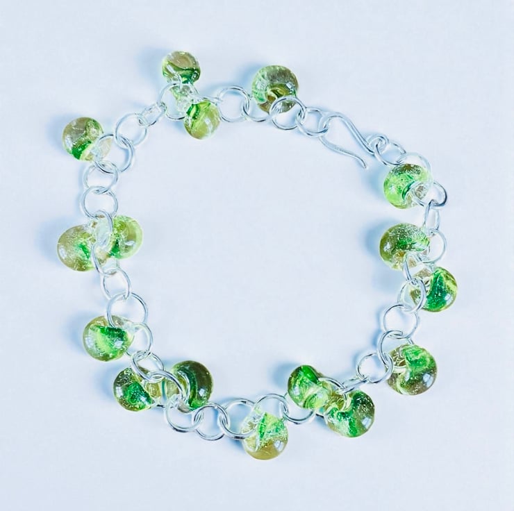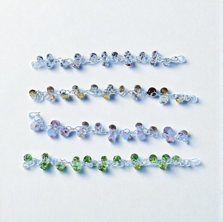 These glass bead bracelets consist of silver rings and colourful borosilicate glass teardrop beads. Each bracelet is finished with a handmade silver hook clasp which hooks into the last ring. Bracelet measures approx. 20cm/8”.