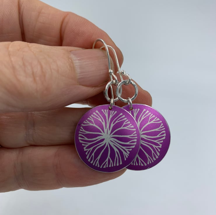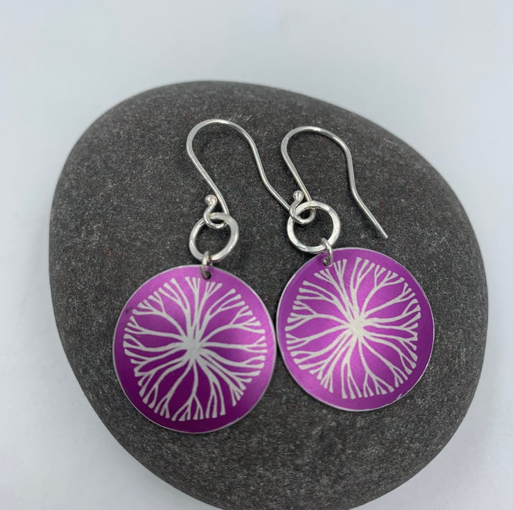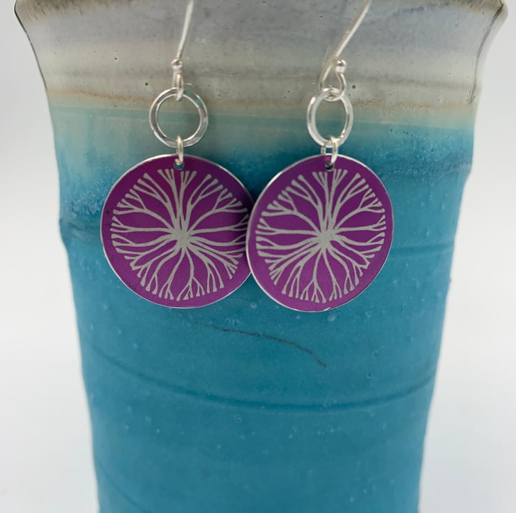 These handmade purple aluminium circle earrings are decorated with an intricate tree design. I hand drew the design before laster etching it onto the beautiful purple dyed metal. The circle was then domed to give it a more 3D shape. I added a handmade hammered silver ring for the earrings to dangle from.