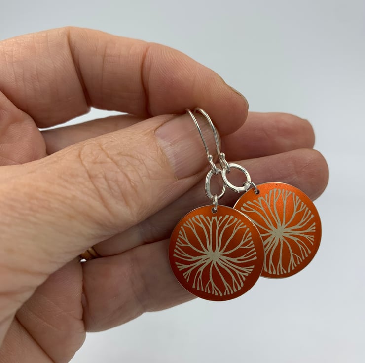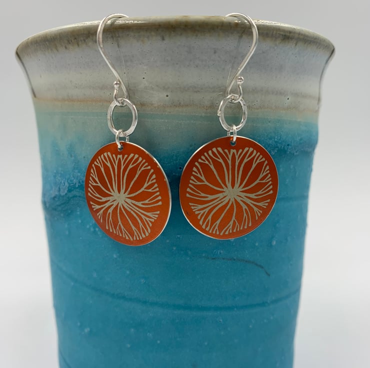Handmade orange aluminium circle earrings with an intricate tree design. I hand drew the design before laster etching it onto the beautiful orange dyed metal. The circle was then domed to give it a more 3D shape. I added a handmade hammered silver ring for the earrings to dangle from.