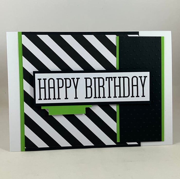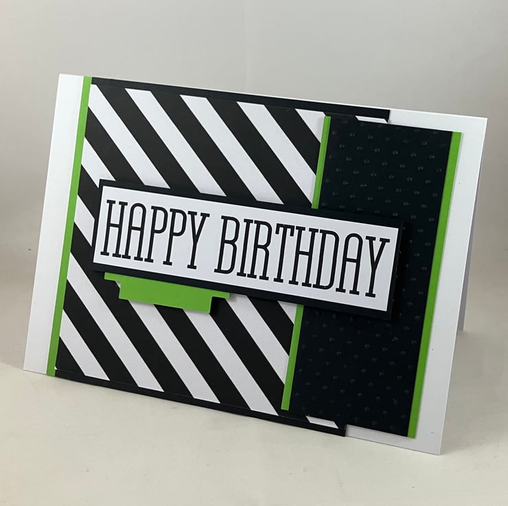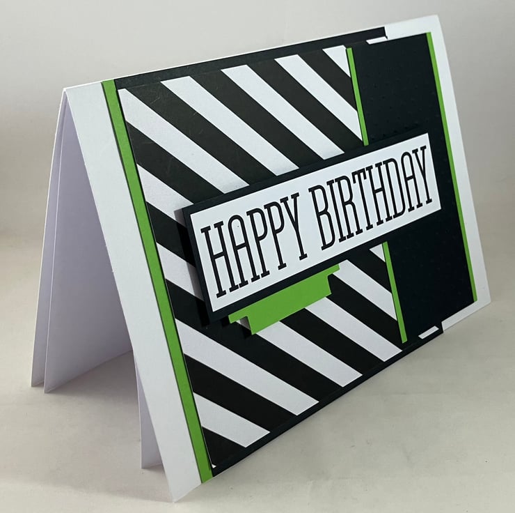 Landscape orientated birthday card with the text Happy Birthday mounted onto black card over a black and white striped background with accents of lime green and an embossed panel of black card.