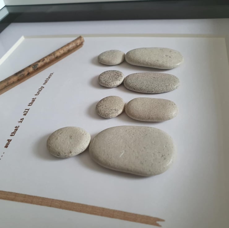 This piece was inspired by the warmth of home and the love that makes it complete. The simple pebbles form a family sheltered under a handmade wooden roof, with the heartfelt message “…and that is all that truly matters.” It captures the essence of belonging and reminds us that family is the truest foundation of happiness.