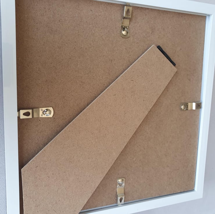 A heartfelt handmade pebble art frame showing a family of four under a wooden roof, with the touching quote ‘… and that is all that truly matters.’ A unique keepsake and the perfect family gift. White wood frame with glass, 22.5x22.5 cm. Freestanding or wall-mountable. Style: minimalist, rustic, eco-friendly.