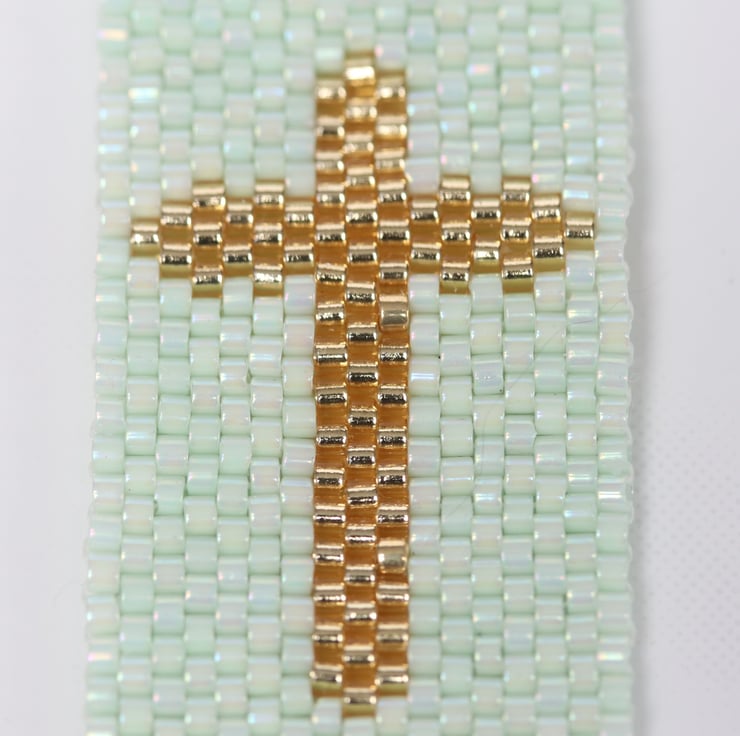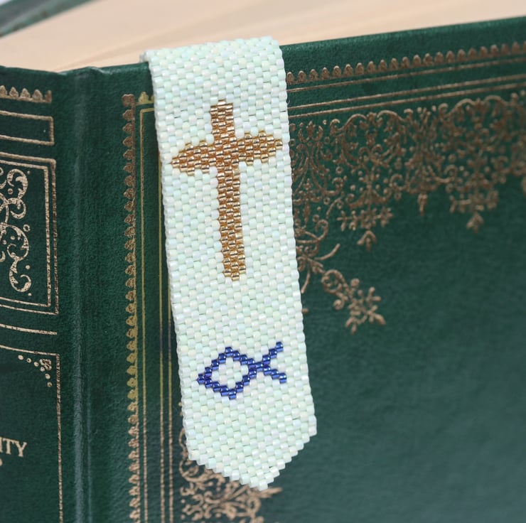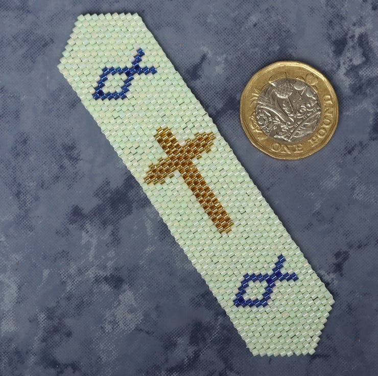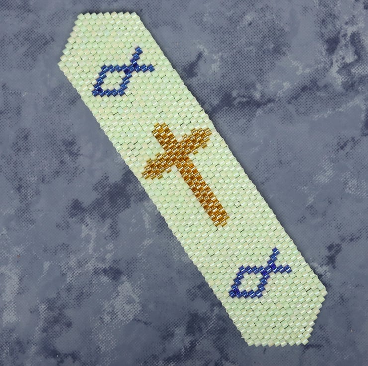 This petite bookmark makes a charming confirmation gift or a special touch to include with a presented Bible. Ideal for both standard and smaller books, it’s slim enough to slip easily into a card for convenient gifting. The bookmark is made from glass delica seed beads which have been stitched together, incorporating Christian symbols: a little gold cross with two stylised cobalt blue ichthyses on a very light green background. The design is my own. I have not stiffened the beadwork at all, so the bookmark is fairly flexible.