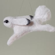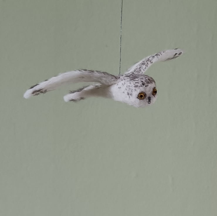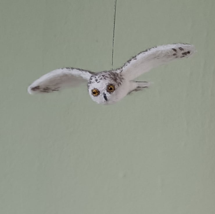 The snowy owl is crafted from pure white wool. Its distinctive markings are applied by hand
