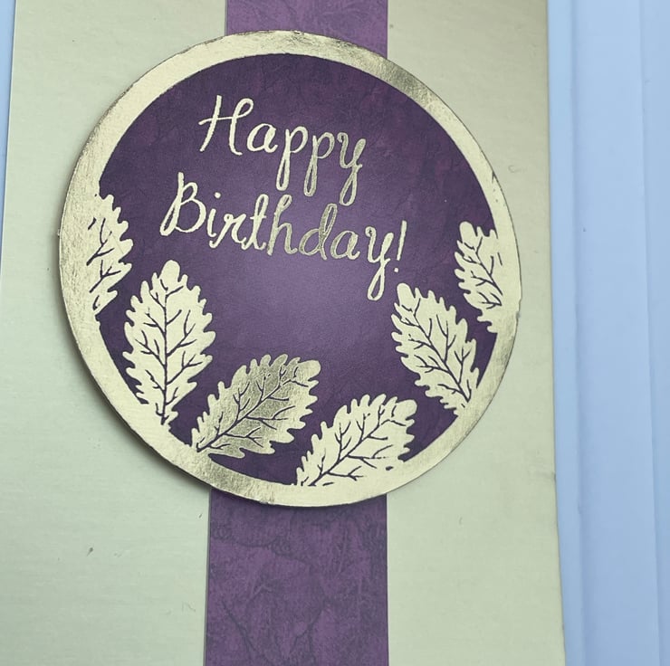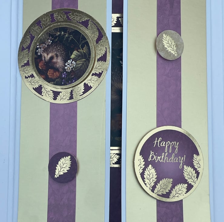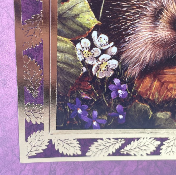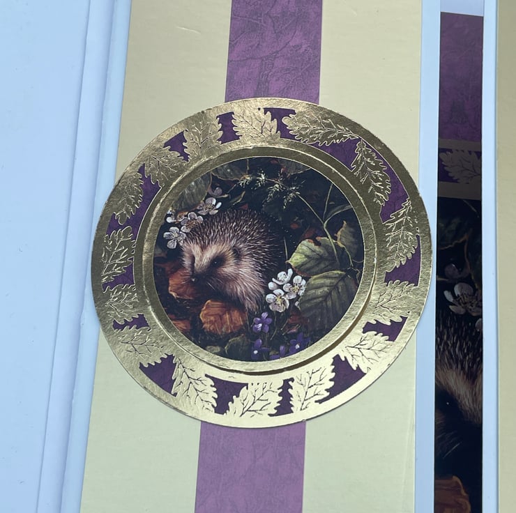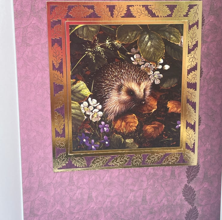 Lets cosy in for Autumn with this cute hedgehog card. This A5 gate fold card features a cute hedgehog snuggled under a hedge . The main image is delightful with bramble flowers and leaves plus fallen leaves of autumn. This is surrounded by a gold and purple frame of leaves. This is on a muted matching purple paper with falling leaves pattern. The 2 doors of the card have a gold background with a strip of matching paper. Theses are topped with a matching hedgehog image, a happy birthday greeting ans more leaves in gold. A beautiful autumnal card.