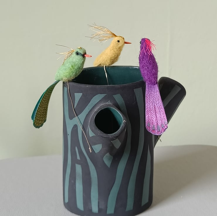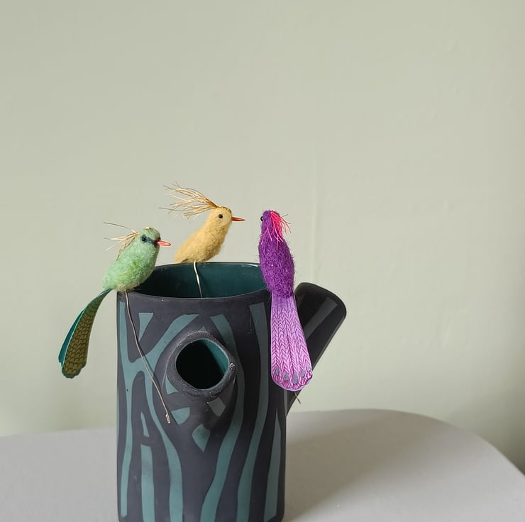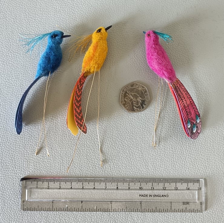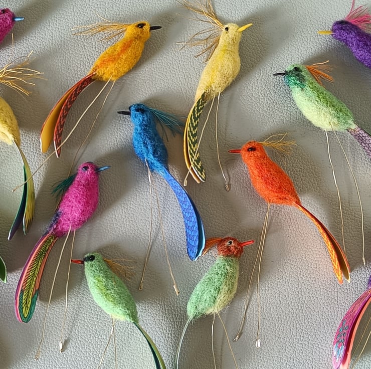 Each bird is meticulously handmade, and crafted from a selection of vibrant coloured felts and card. To