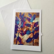 This image was produced using a variety of materials, printing from plants with acrylic paint and working into the image with fine-liner pens. It’s mounted on acid free board and has an off white bevelled cut mount. The internal measurement of the image is 7.25 x 9.25 inches or 18.4 x 23.4 cm. The overall measurement including the mount is 10 x 12 inches or 25.4 x 30.4 cm. This is a standard size for framing.