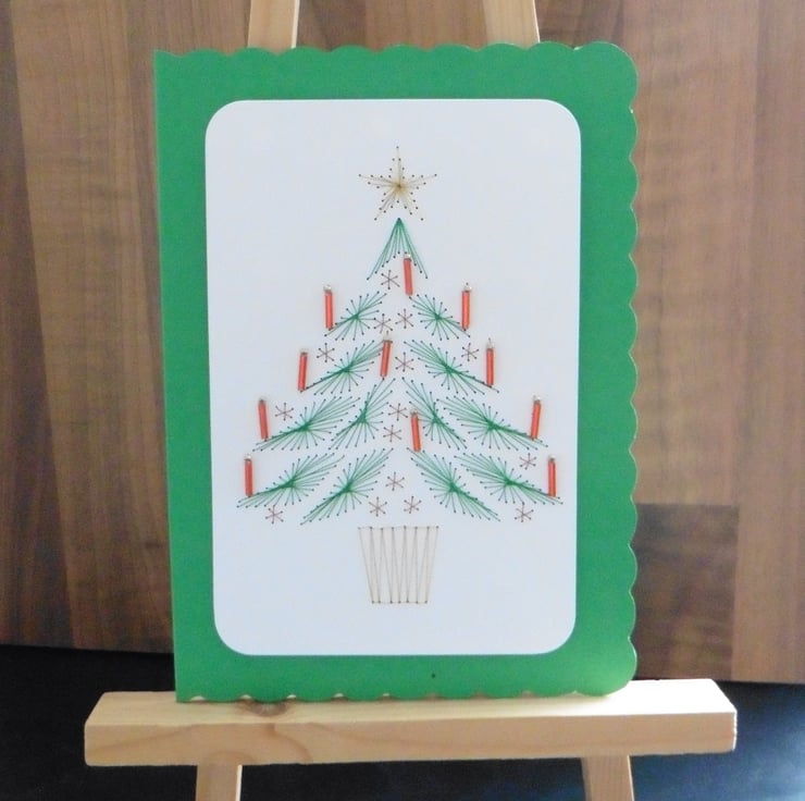 Christmas tree with beaded candles on a green scalloped edge card x 1