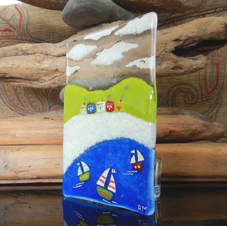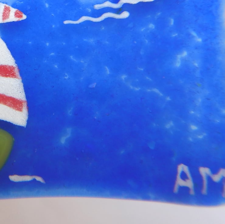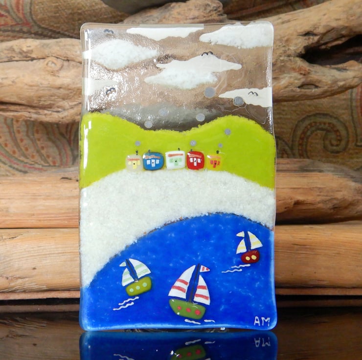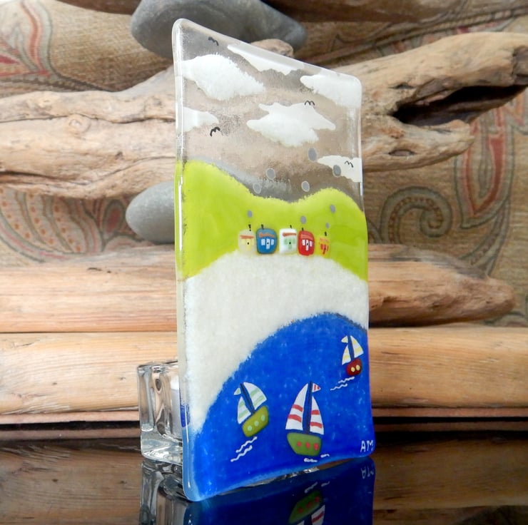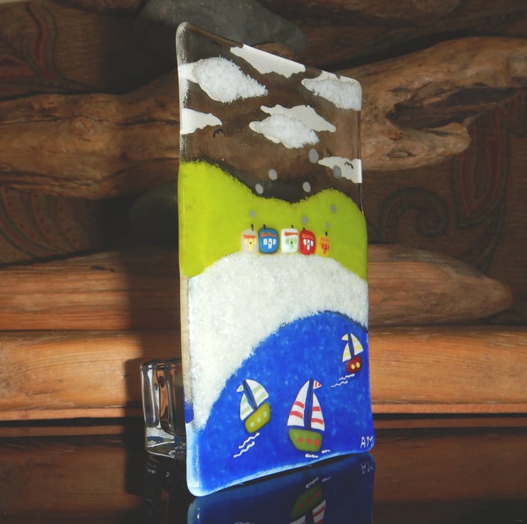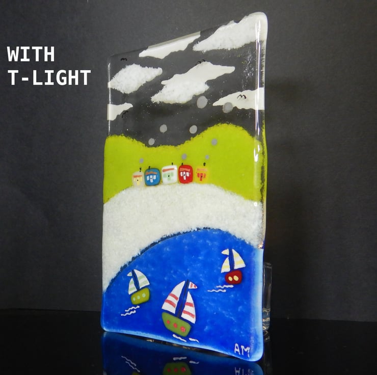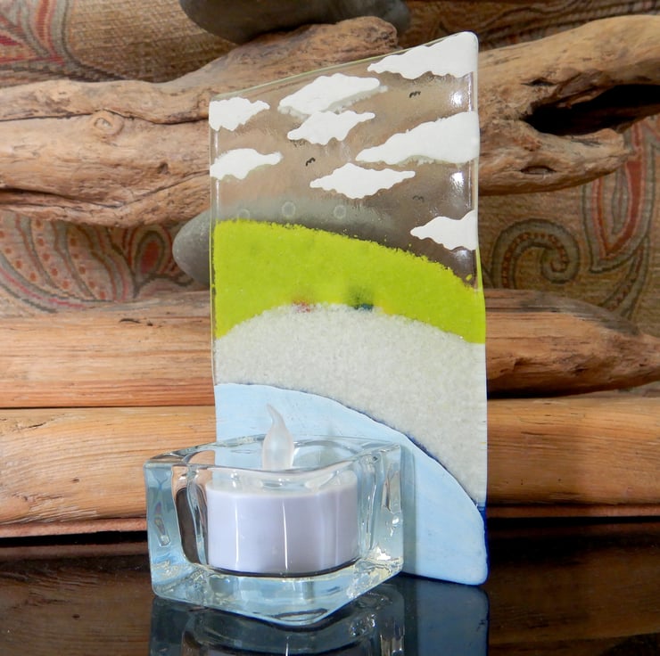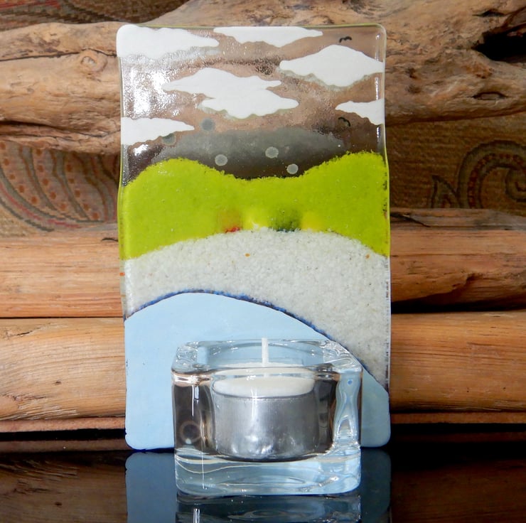 Lovely, bright, colourful, and cheerful T-light holder. Carefully made by myself using bullseye glass, dichroic glass, and frit glass. Each piece of glass was positioned carefully to make sure that the composition was balanced, and that it would have maximum visual impact.
