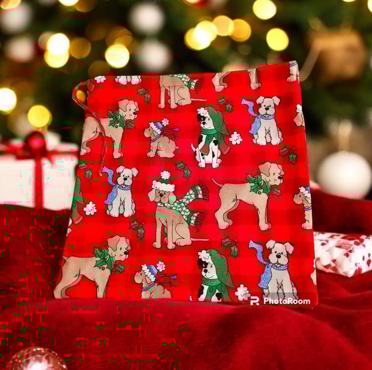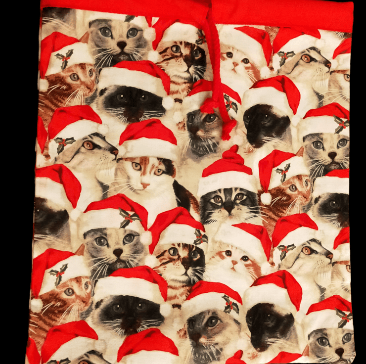 A fun, eco-friendly twist on classic gift wrap that’s as versatile as it is charming. Crafted from a soft cotton blend fabric. The dog version features various dogs wearing hats and scarves and is printed on red check fabric and ties with a multicoloured cord. The cat version features lots of cats wearing Santa hats and ties with a red cord.