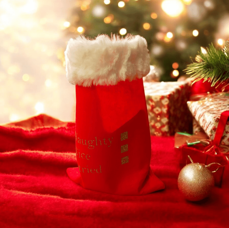 The red felt sack features a faux fur trim, it comes with a little bow to attach to the appropriate tick box.