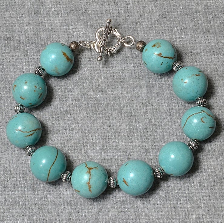 This is a bright, simple, chunky bracelet, perfect for adding a bold splash of colour to an outfit. It’s made from turquoise blue stone beads, which came from an unlabelled batch so I’m unsure exactly what they are. Best guess is probably synthetic turquoise, maybe dyed howlite, but whatever the origin, they’re cool, weighty, and colourful. In this bracelet, they’re teamed with decorative metal spacer beads.