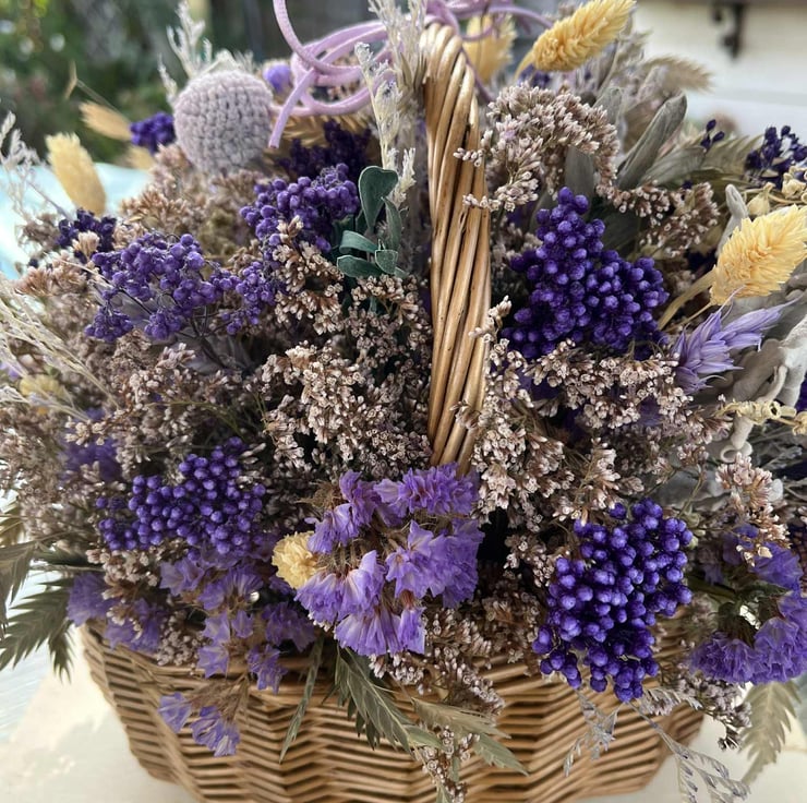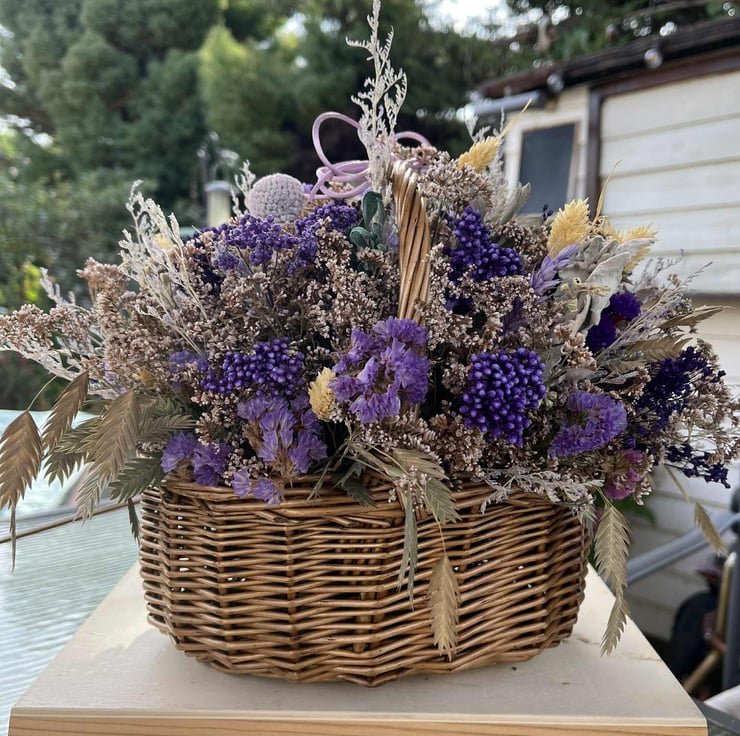 A pretty basket of dried flowers using Statice and other flowers and seed heads in a purple colour. This is a sustainable product using chicken wire inside the basket and not floral foam so is 100% recyclable. This measures approx 30 cm in length and in height.