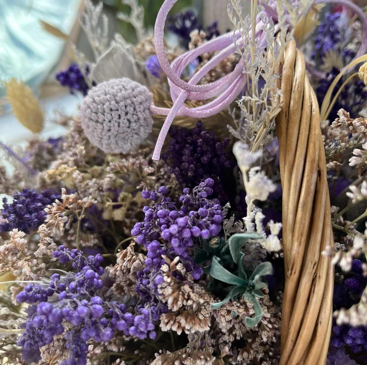 I like to be sustainable in my craft and this basket is filled with dried flowers inserted into chicken wire and not floral foam. This basket is made with a vibrant purple using Statice collected from my allotment. This would make a lovely table decoration, especially at this time of year when Autumn is fast approaching.