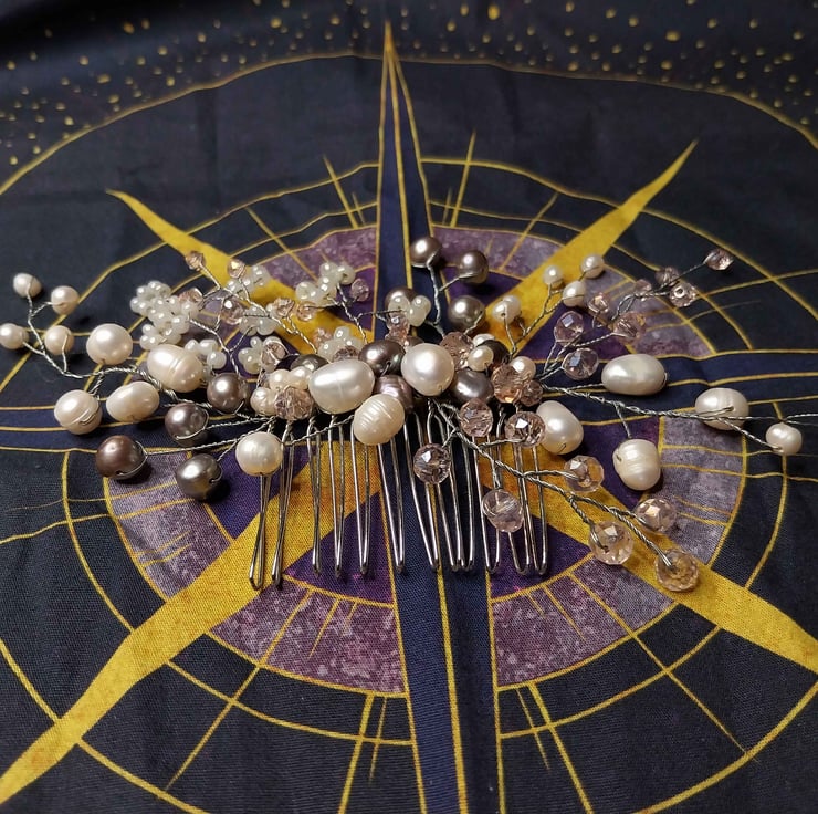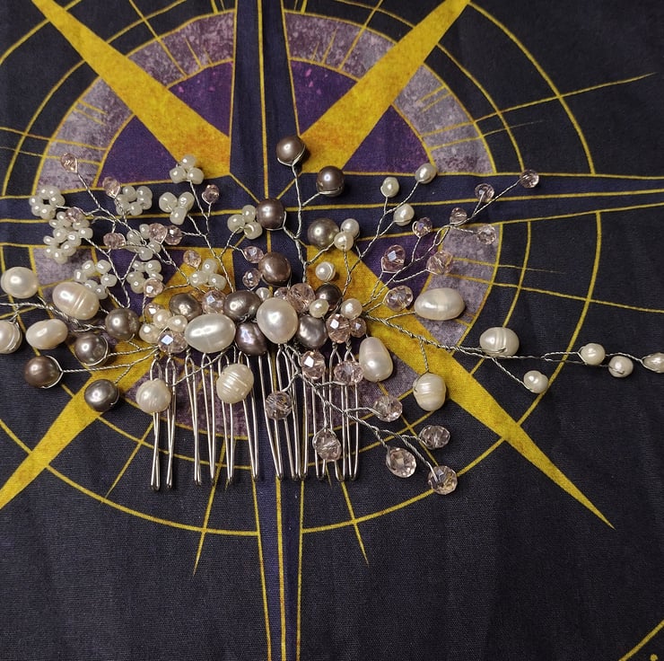 This comb is made with beautiful dark grey and normal cream coloured freshwater pearls with pink crystals and elegant glass seed beads.