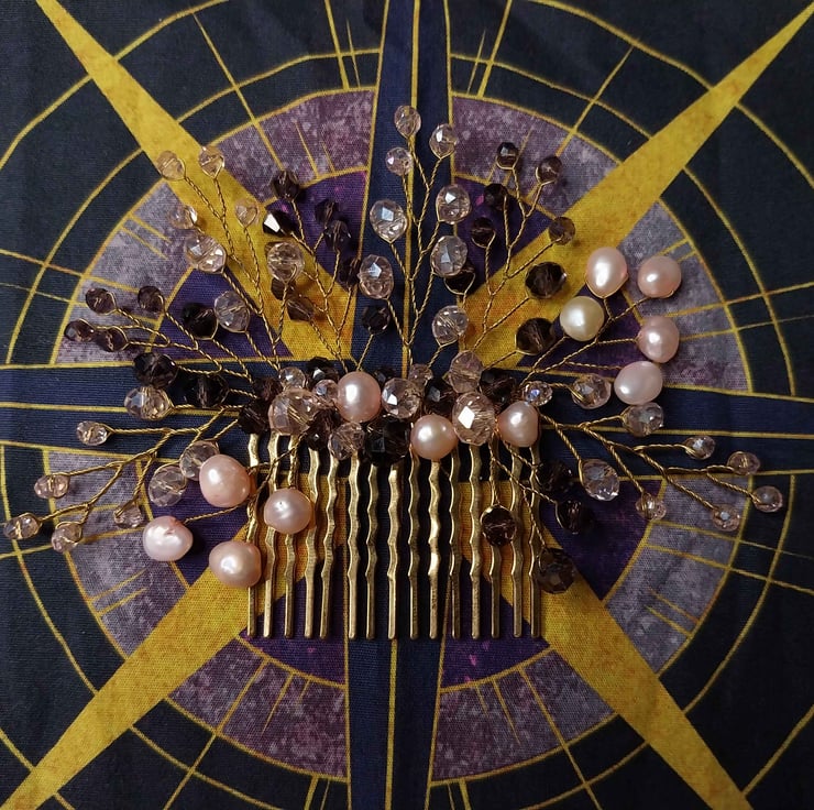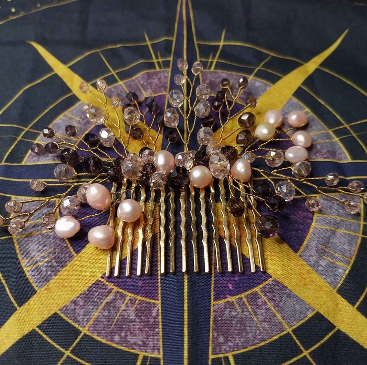 Beautiful pink freshwater pearls and crystals mixed with rich purple crystals wired onto a golden comb.