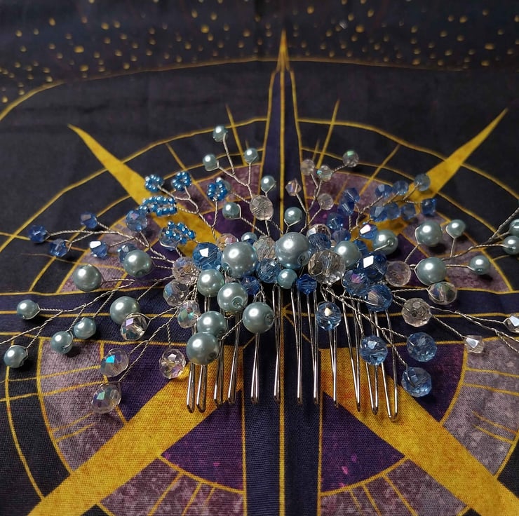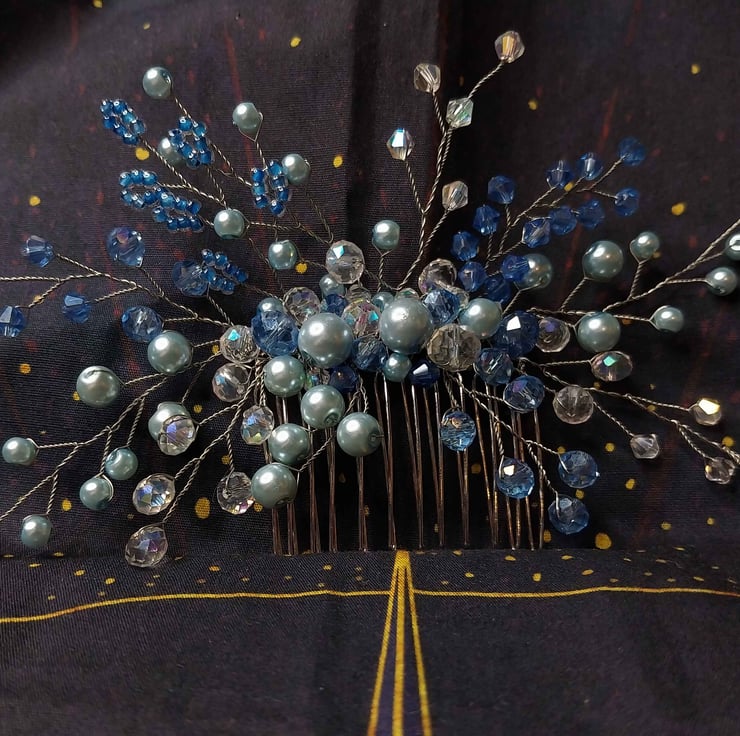The design is securely wired to a metal comb measuring 4.5cm wide x 3.5cm tall.