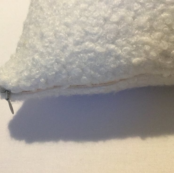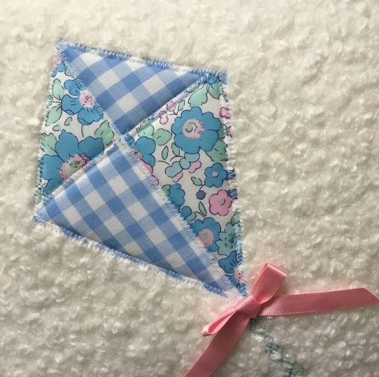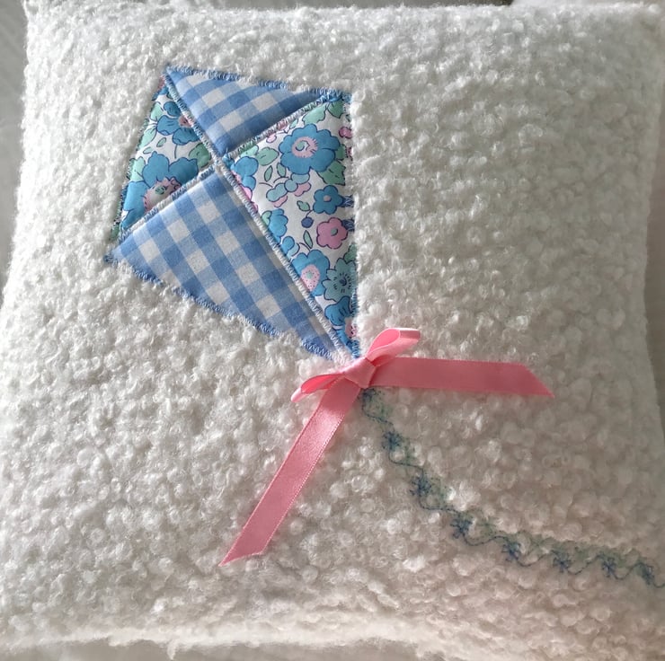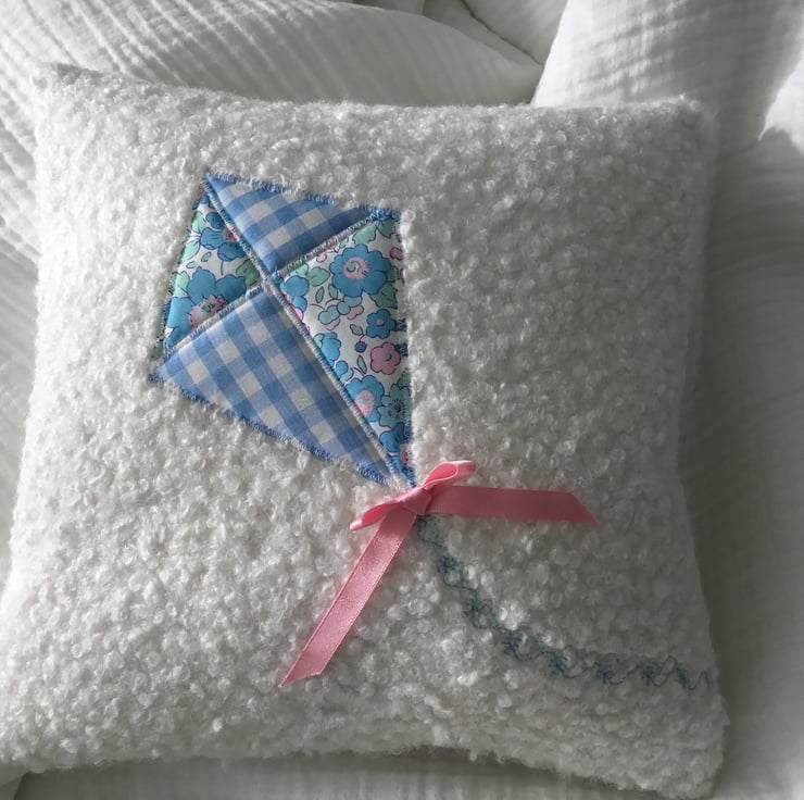 Small nursery cushion made in a boucle fabric with an appliquéd kite made from Liberty fabric. Measuring approximately 30cm x 30cm, to include a feather pad, the cushion closes with an invisible zip along the bottom. The seams have been overlocked for neatness and strength.