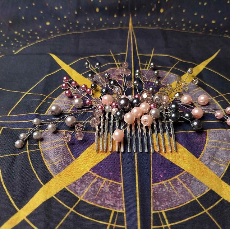 Stunning pink and grey hair comb made up of glass pearls and crystals.