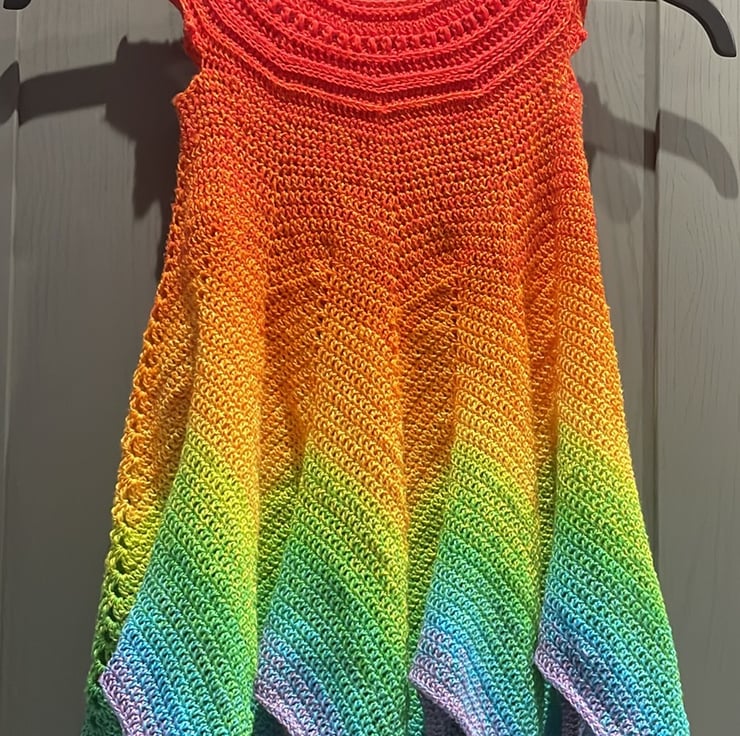Crocheted fairy dress made to order in your choice of colour. Dress in pictures is made from a rainbow ombré yarn.