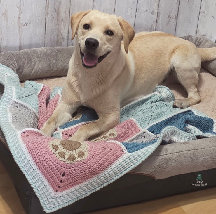 The Puppy Pawprint Blanket is made up of plain solid granny squares and motif squares throughout the body, joined using crochet stitches. The border is made up of 8 rounds using mostly moss stitch with reverse crochet for the edging. I’ve used Stylecraft Special Aran for this blanket, but it’s a great stash busting project. The finished blanket is 42" x 32".