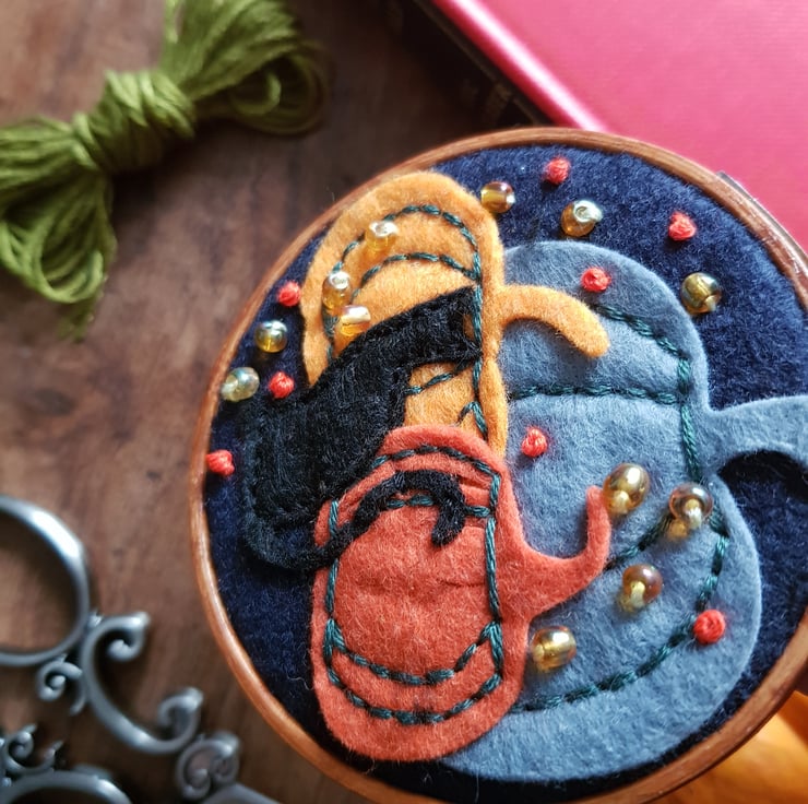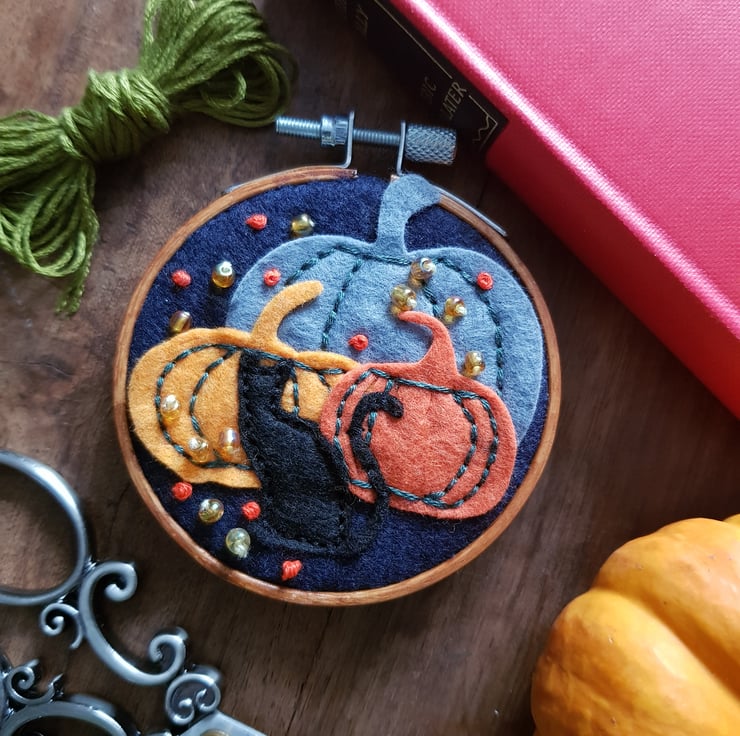 Embroidery hoop art 7.5cm/3inch ready to hang on the wall. This wall decoration was inspired by the warm colours of pumpkins that are highlighted by the dark silhouette of a black cat.