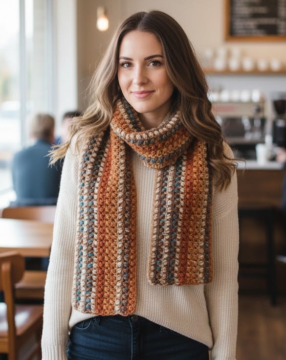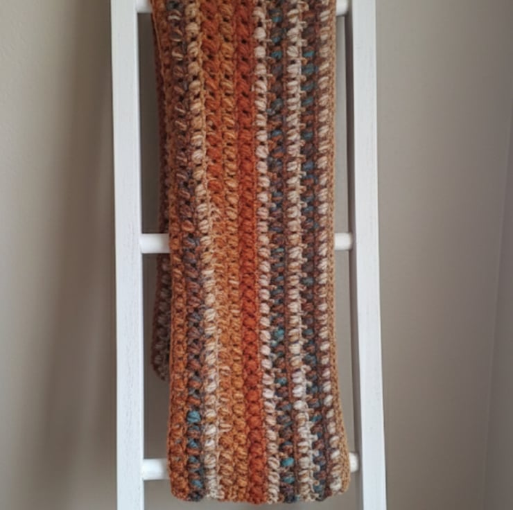 Stay warm and stylish with this beautifully handcrafted crochet scarf. Featuring a thick, textured stitch that provides incredible warmth and a soft feel, this scarf is the perfect accessory for crisp autumn days and cold winter nights. The rich blend of rust orange, mustard gold, cream, and deep blue-teal accents makes it a versatile piece for any wardrobe.