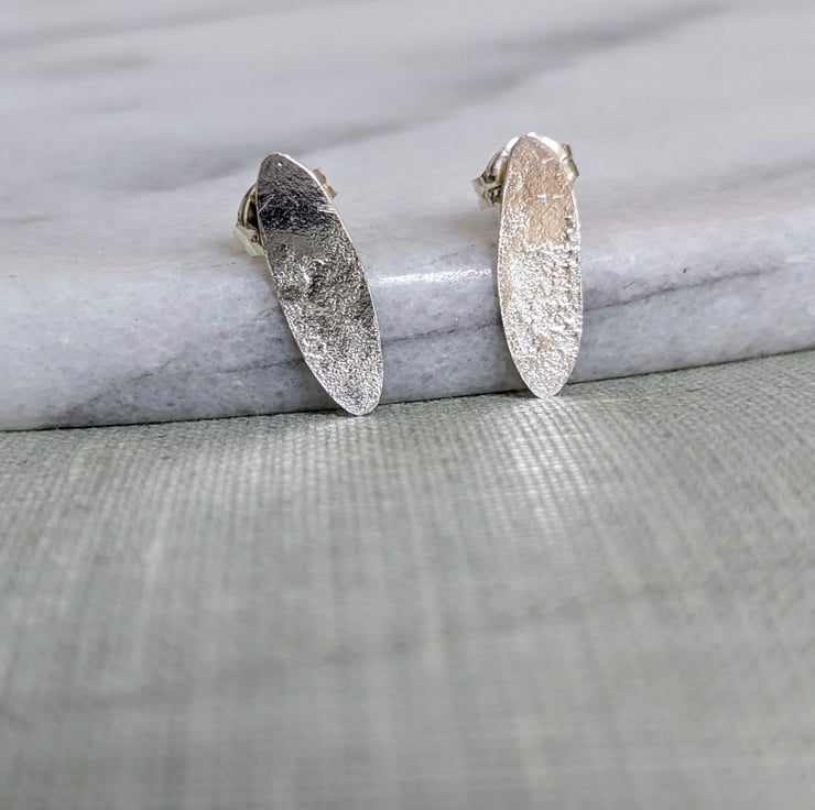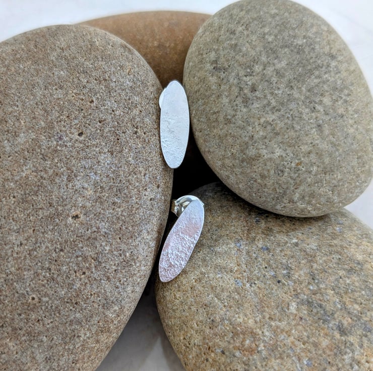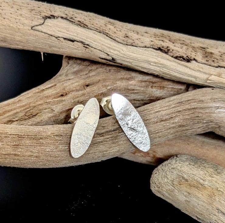 An easy to wear everyday pair of small oval stud earrings with a little shimmer. These are handmade using recycled sterling silver and for pierced ears only.