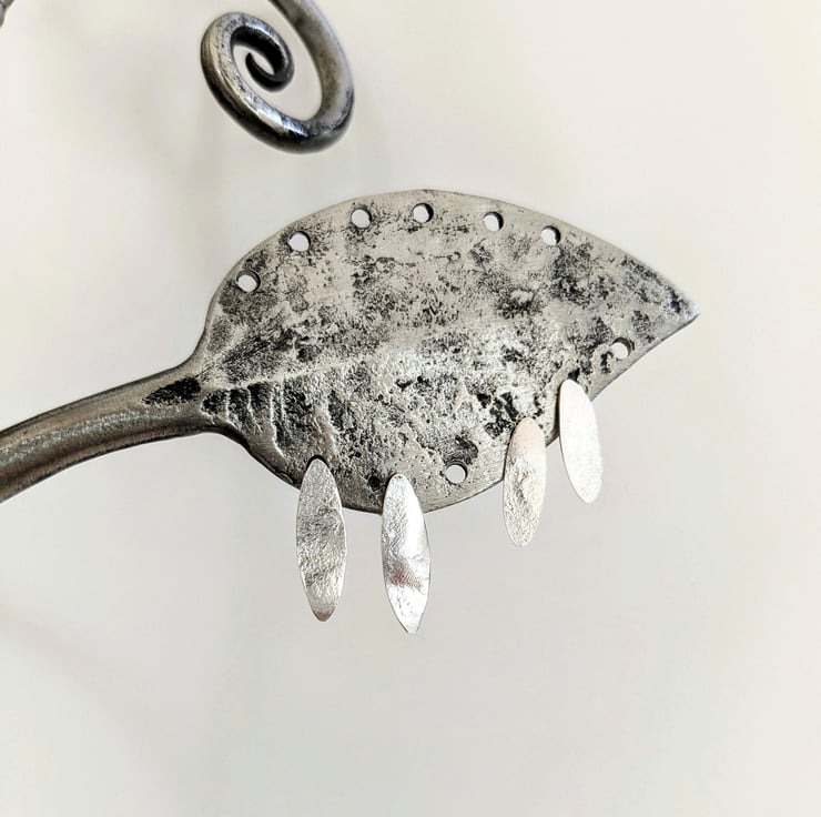I have handmade each earring by using a technique called reticulation where the silver is heated until it starts to bubble and melt, this creates different textures and frosting on the silver that's unique to that bit of silver. They have been hand polished to a high shine so that the hammering texture catches the light.