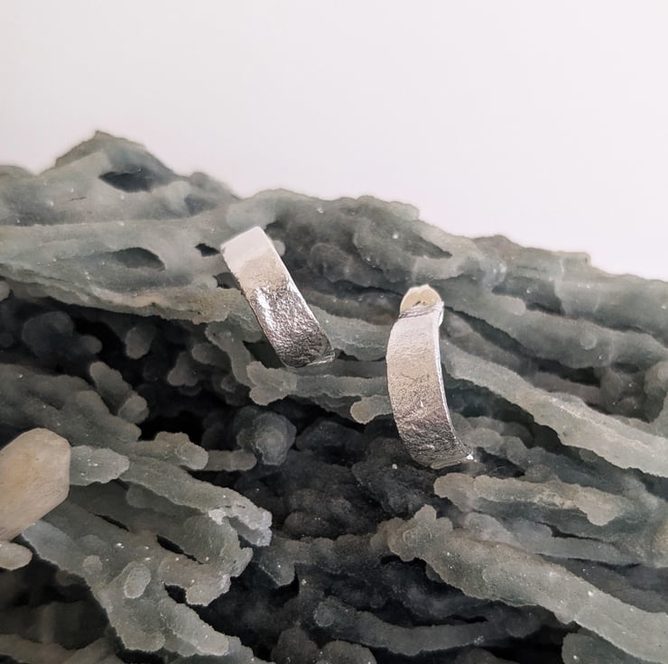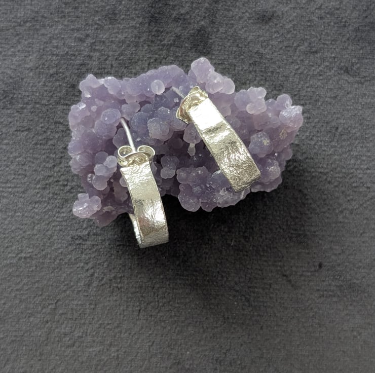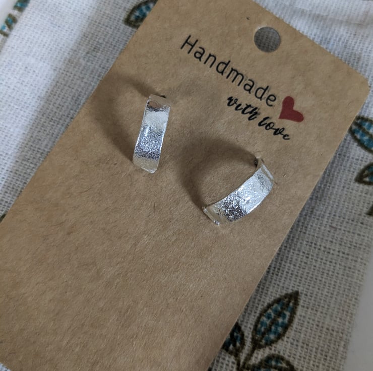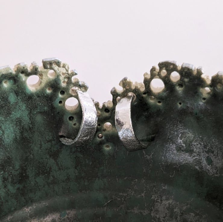 I have handmade each earring by using a technique called reticulation where the silver is heated until it starts to bubble and melt, this creates different textures and frosting on the silver that's unique to that bit of silver. They have been hand polished to a high shine so that the hammering texture catches the light.