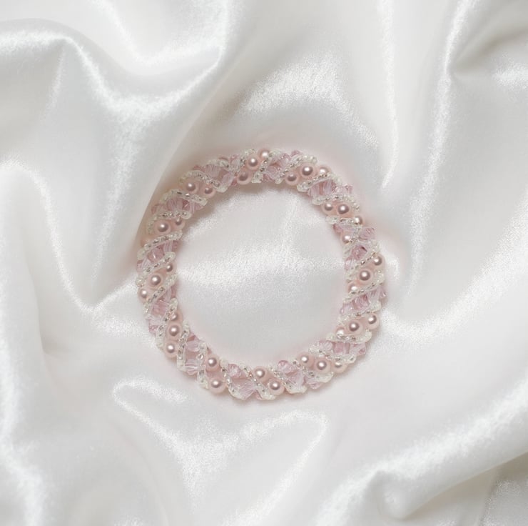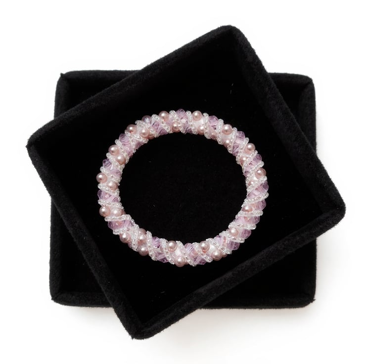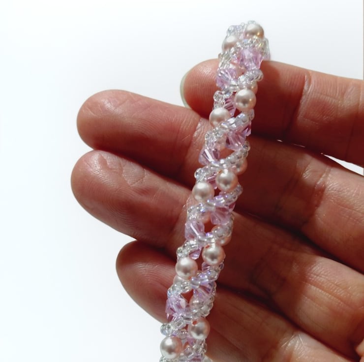 This handcrafted bracelet combines timeless elegance with a touch of sparkle. Made with genuine Swarovski cyrstal pearls, Swarovski bicone beads, and Japanese seed beads, it shimmers beautifully with every movement.