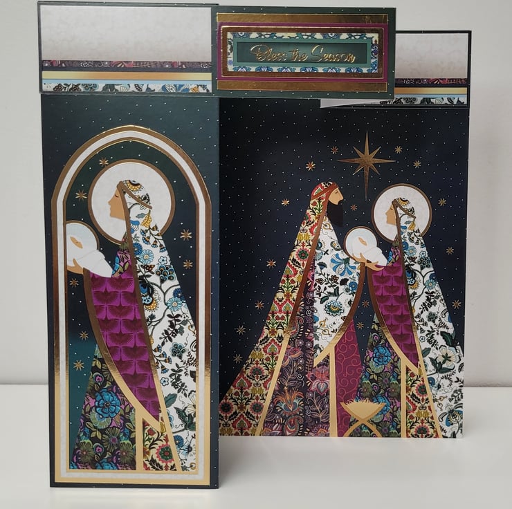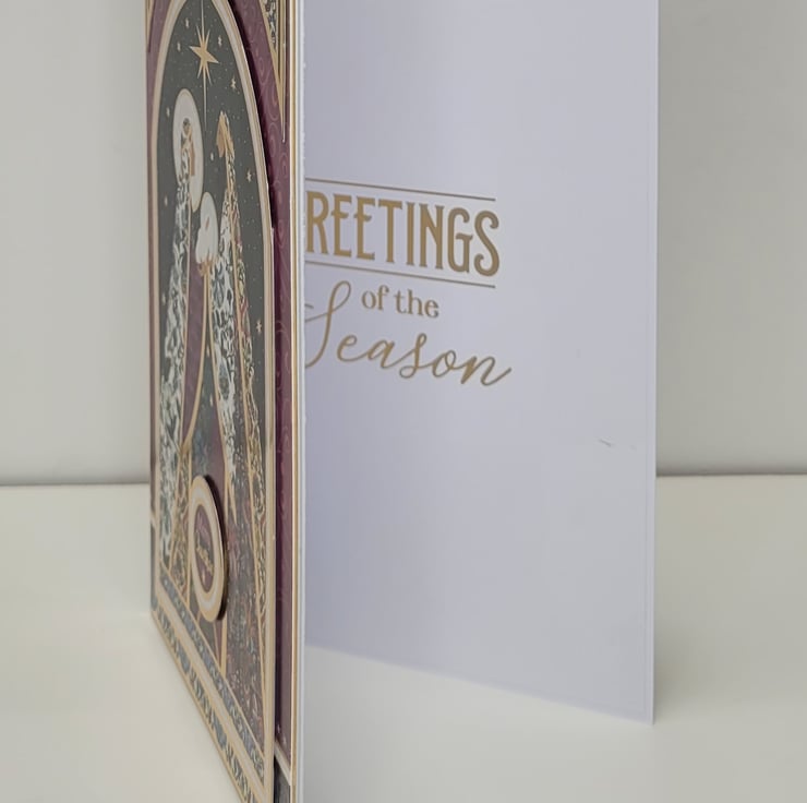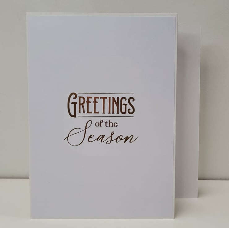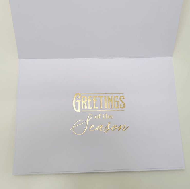 Each card, whilst different in shape and style, measures 7 x 5 inches, are supplied with plain white envelopes and each contain a gold foiled sentiment on the inside of the card which reads "Greetings of the season"