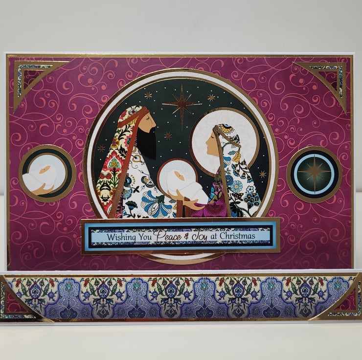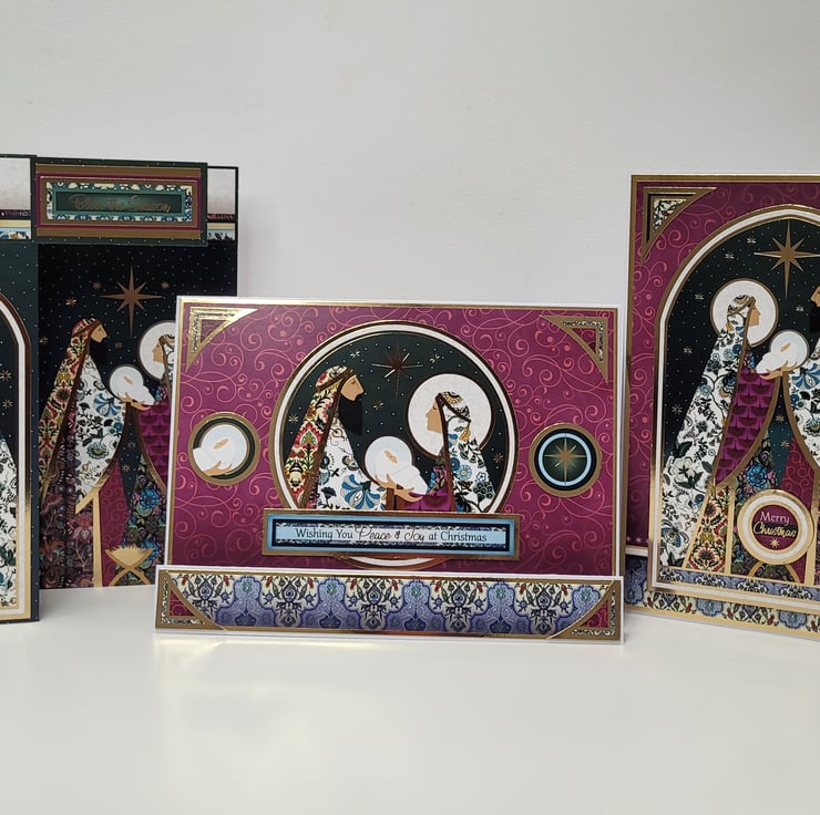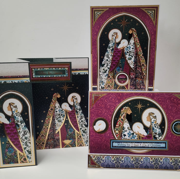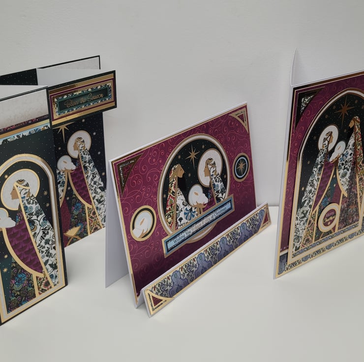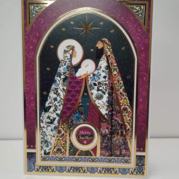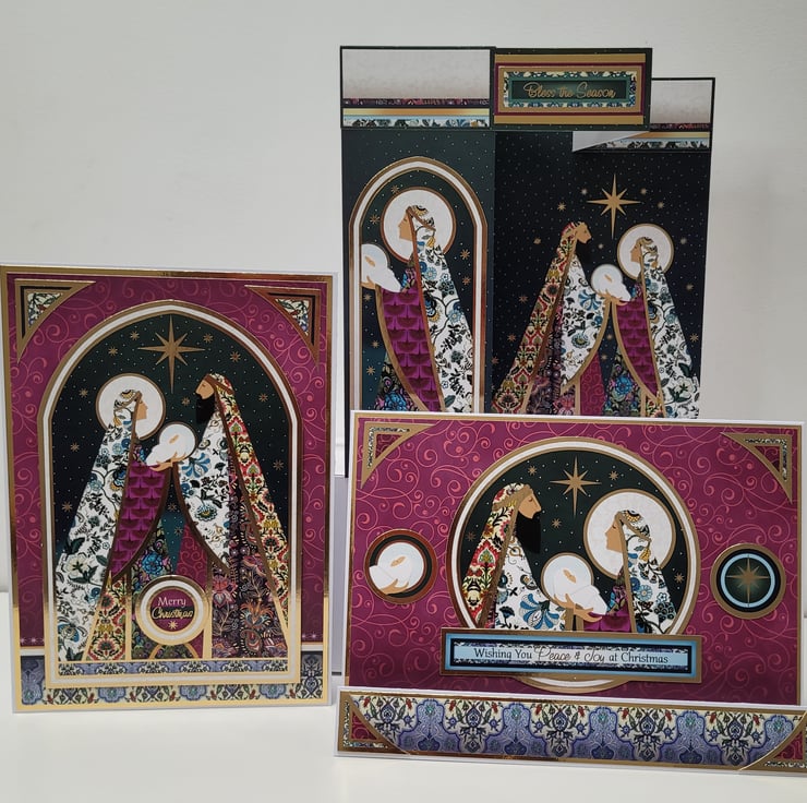 A set of 3 handmade, contemporary Christmas cards depicting a stylised Mary, Joseph and Baby Jesus, with a distinct Moroccan feel.