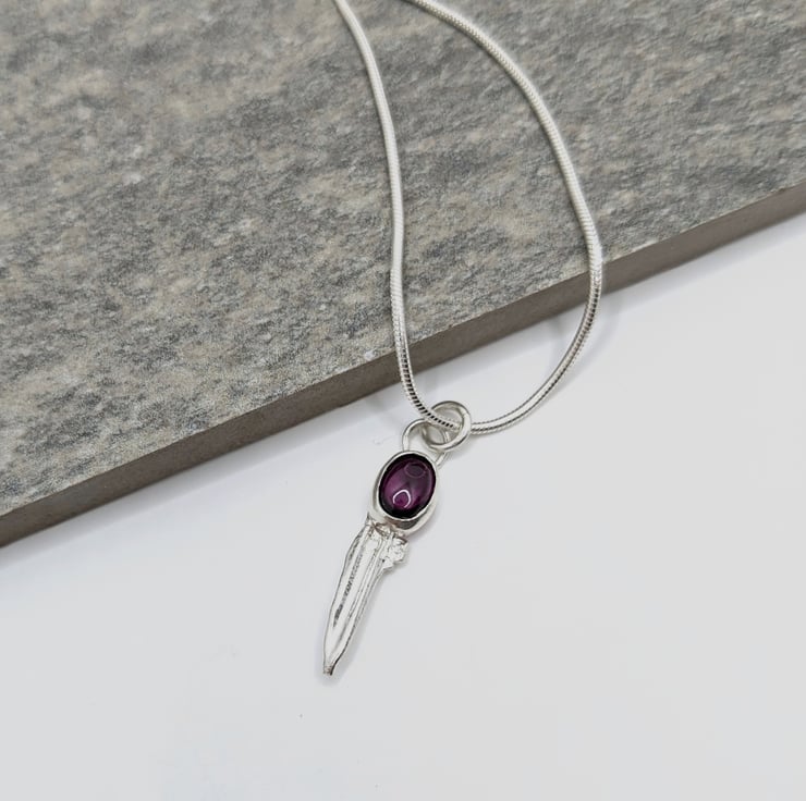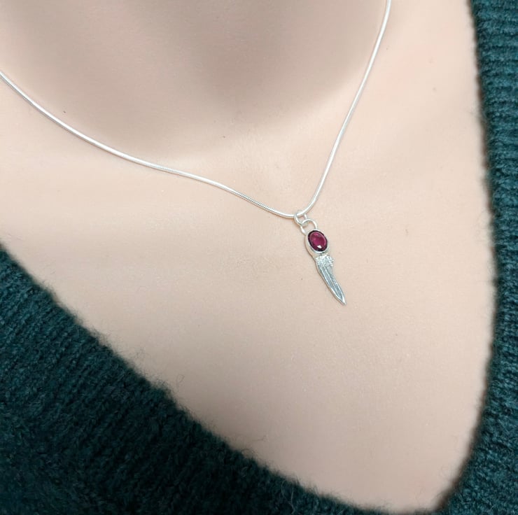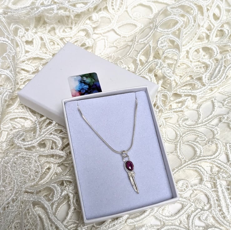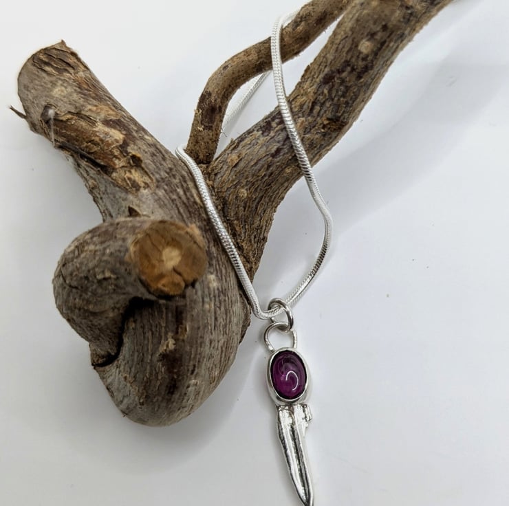 I have handmade this charm/pendant using organic casting techniques where molten silver is poured over objects to form interesting and unique patterns, in this case I used spaghetti. I have then set a beautiful 4mm by 6mm deep pinky red Rhodolite Garnet into the rippled silver casting piece. It hangs from a handmade chain that can be adjusted from 16 to 18 inches.