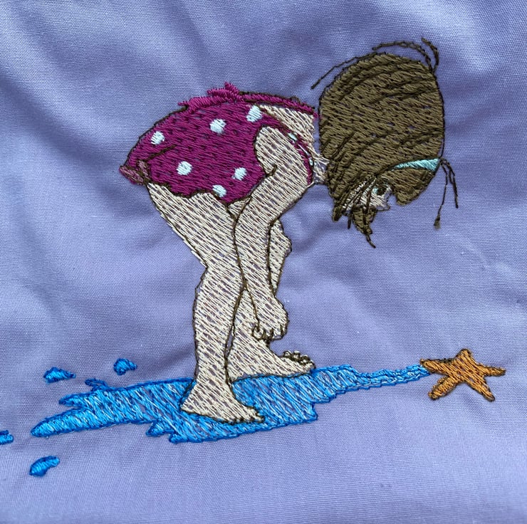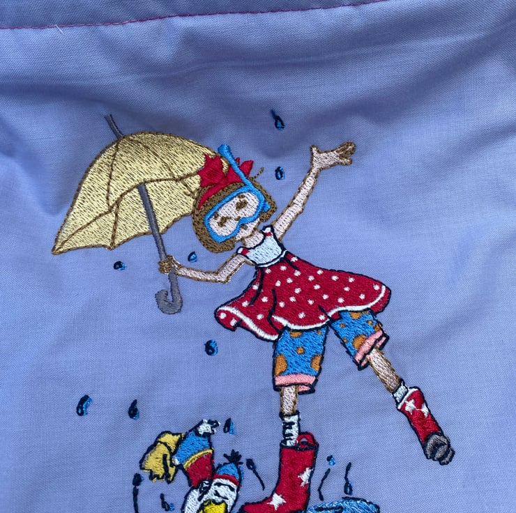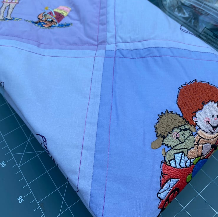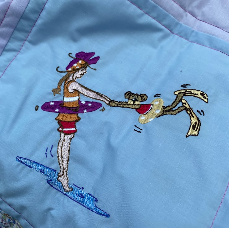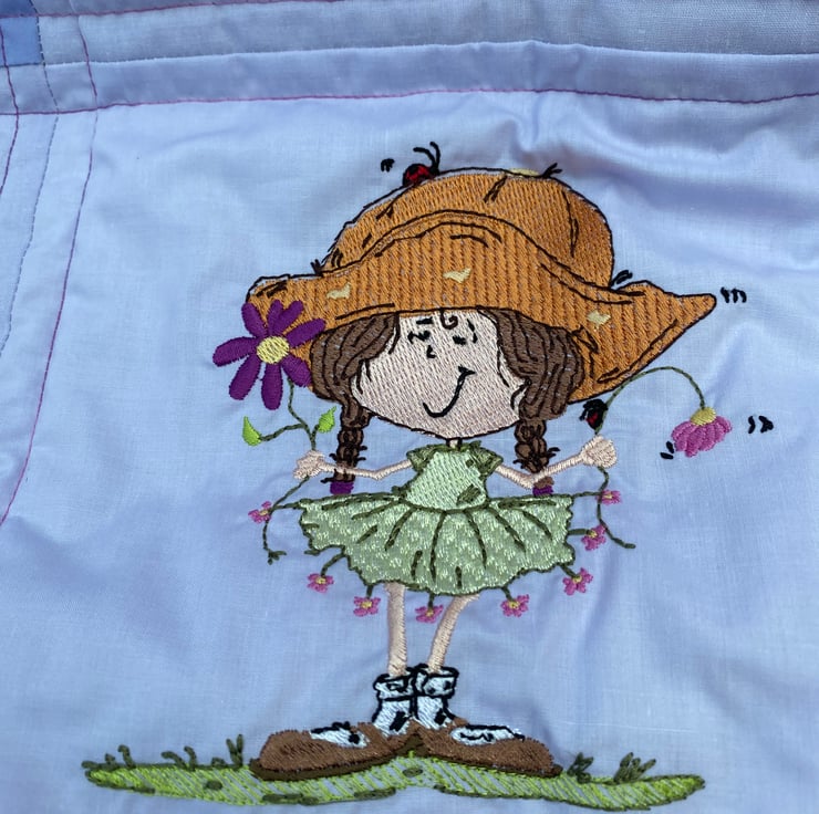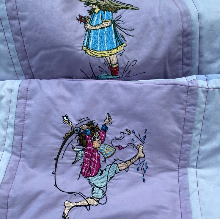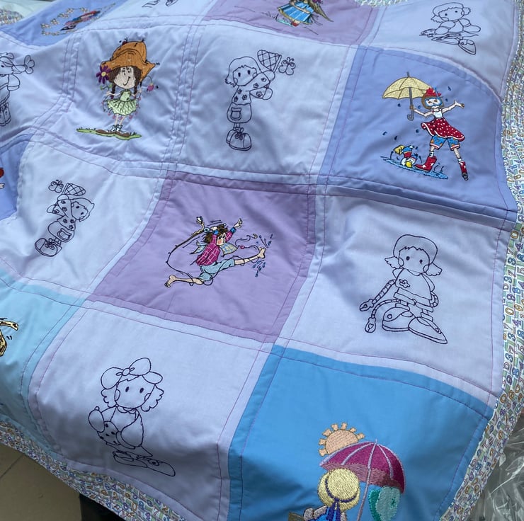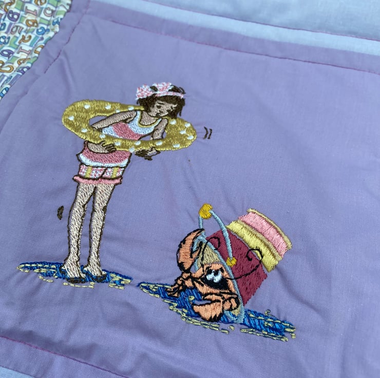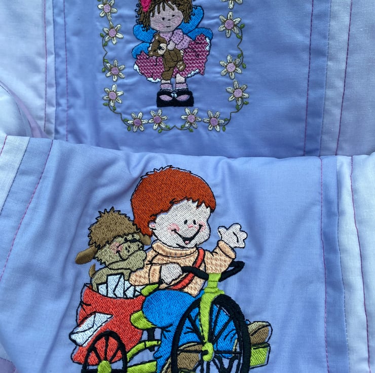 This squishy quilt will be a nice addition to a child’s bedroom with lots to look at and chat about. The embroideries are of cheerful activities such as ‘ singing in the rain ‘ - picking daisies - talking to a crab - riding a trike - etc.