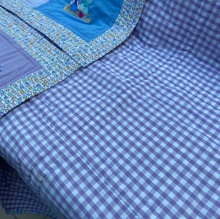 It measures 39” x 48” ( 100cms x 122cms ), is in shades of blue and lilac quilting cotton blocks, with a border showing numbers and a lilac gingham cotton backing.