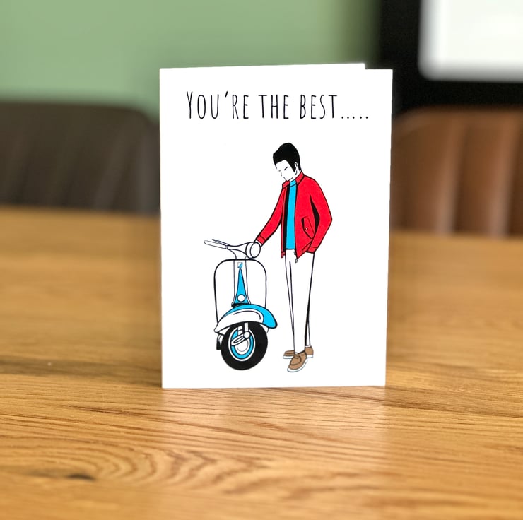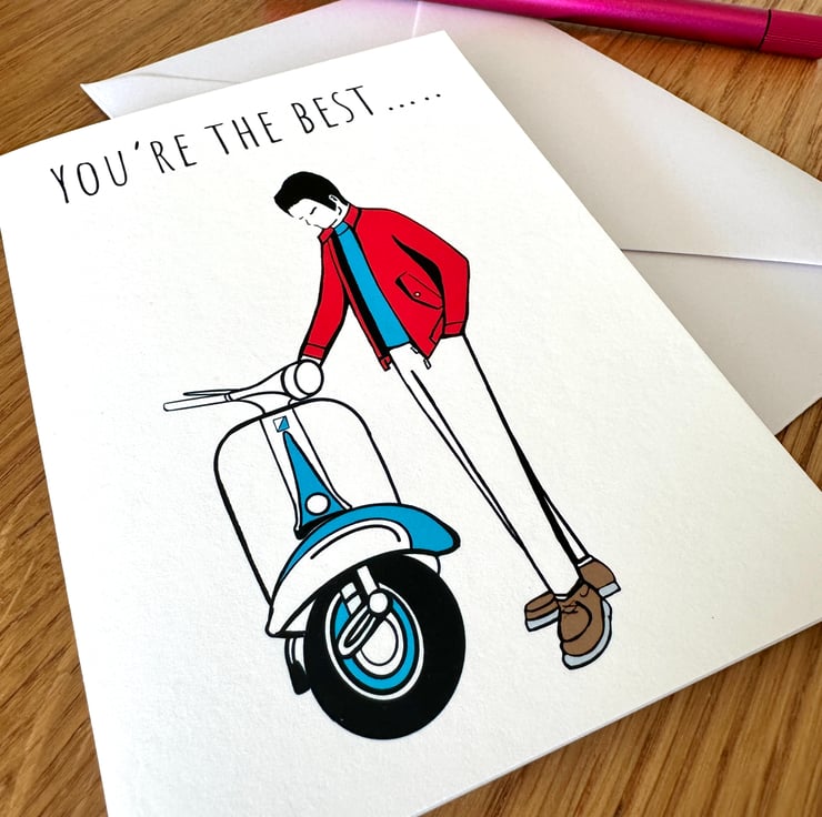 The scooter in this design is based on my own beautiful 1962 Vespa GS160 Mk 1. I have own and ridden vintage vespas for as long as I can remember and they often feature in my illustrations.