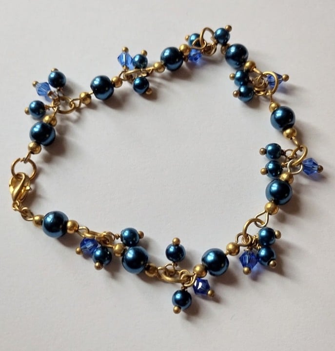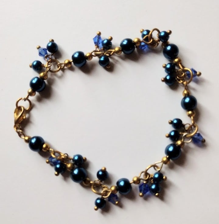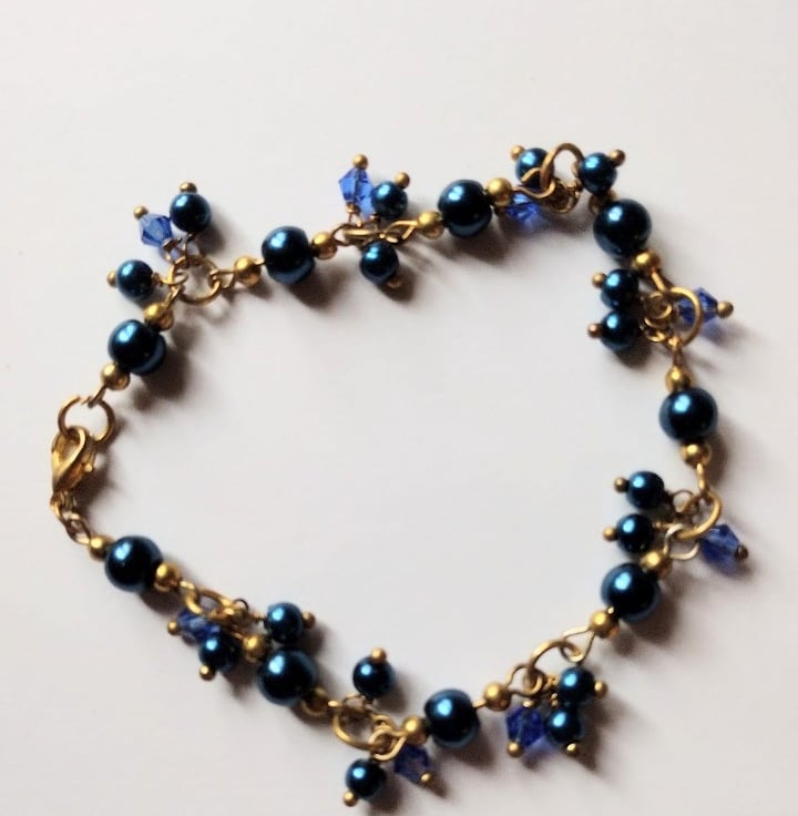 Made with crystals and glass pearls, a golden plated bracelet.
