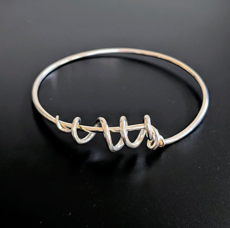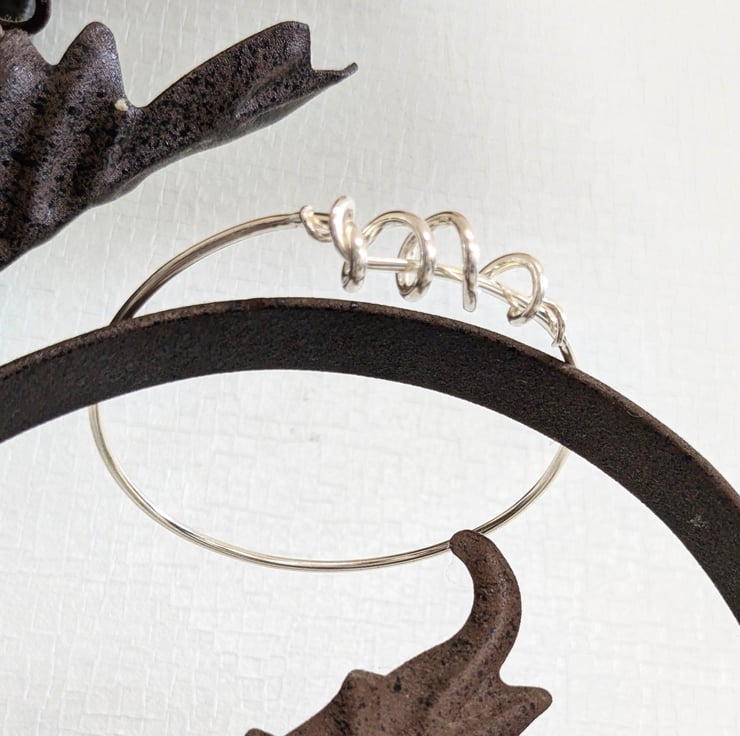 A handmade unique bangle made from thick recycled sterling silver wire and formed into a curling vine.