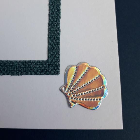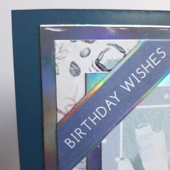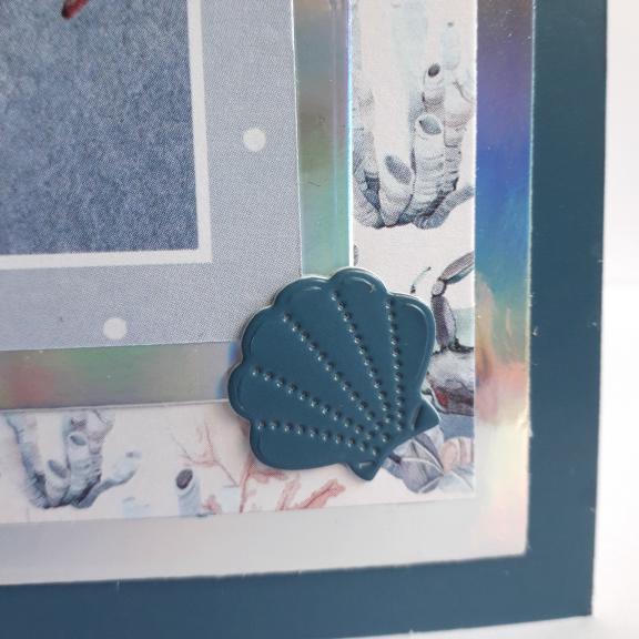 I have placed the image onto silver holographic card then a sea life themed patterned paper, more holographic card and finally a slate blue base.