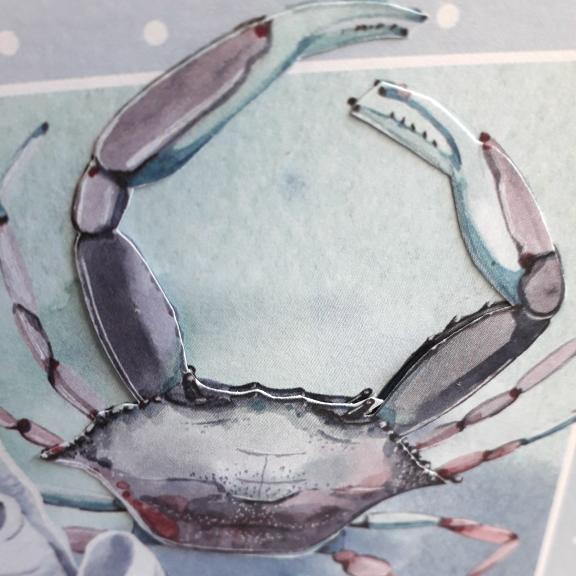 I have added a little bit of extra dimension with another layer of the crab shell and claws, there is a "Birthday Wishes" banner across the top left corner of the image and a die cut shell in the opposite corner.
