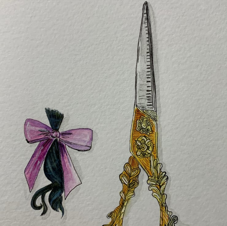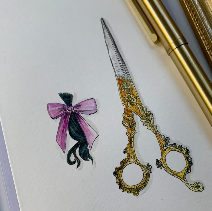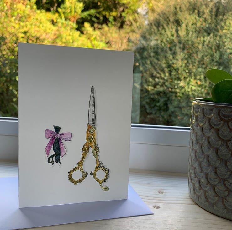 This original hand-painted card is a true one-of-a-kind keepsake. Painted with artist-grade watercolours on smooth hot-pressed paper, it features an ornate pair of golden vintage scissors alongside a delicate black lock of hair tied with a pink/violet ribbon.