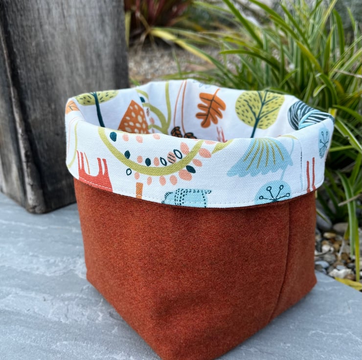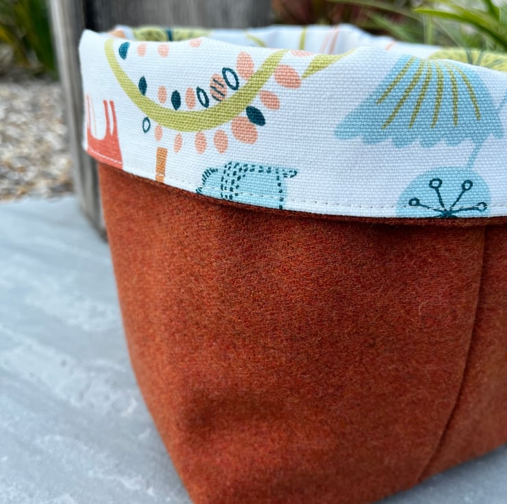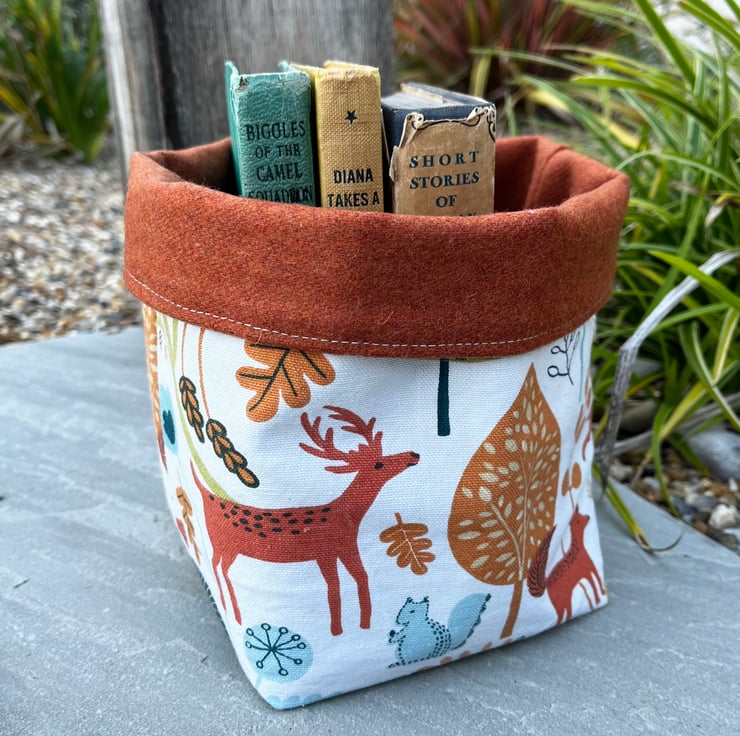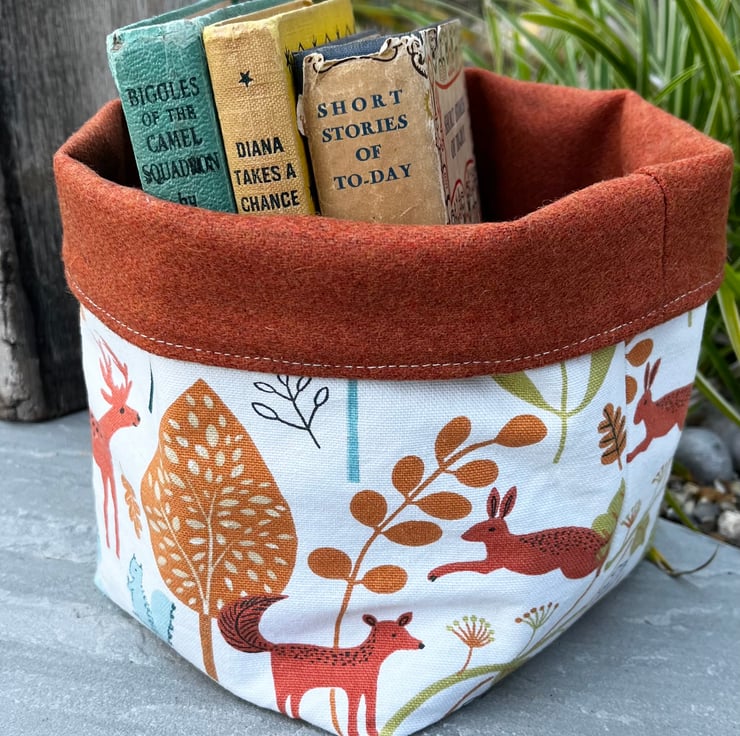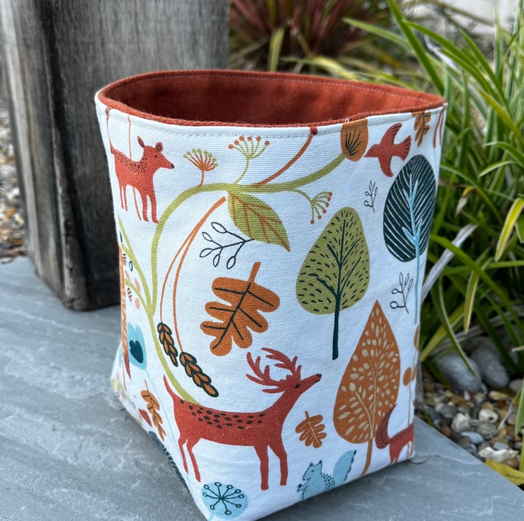 Reversible storage basket made from cute cotton with a forest animals print and soft orange upholstery wool. A layer of interfacing between the layers makes it sturdy. Can be used with a turn-down to make the most of the contrasting fabrics.