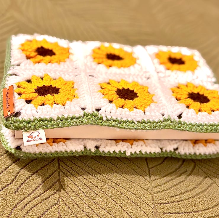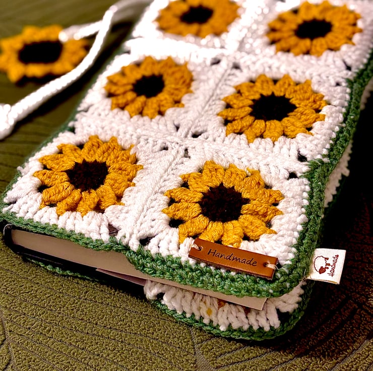 Handmade sunflower hardbook cover! Each cover is made with durable acrylic yarn. Why not protect your beautiful hardback books when taking them out and about!