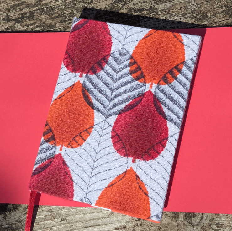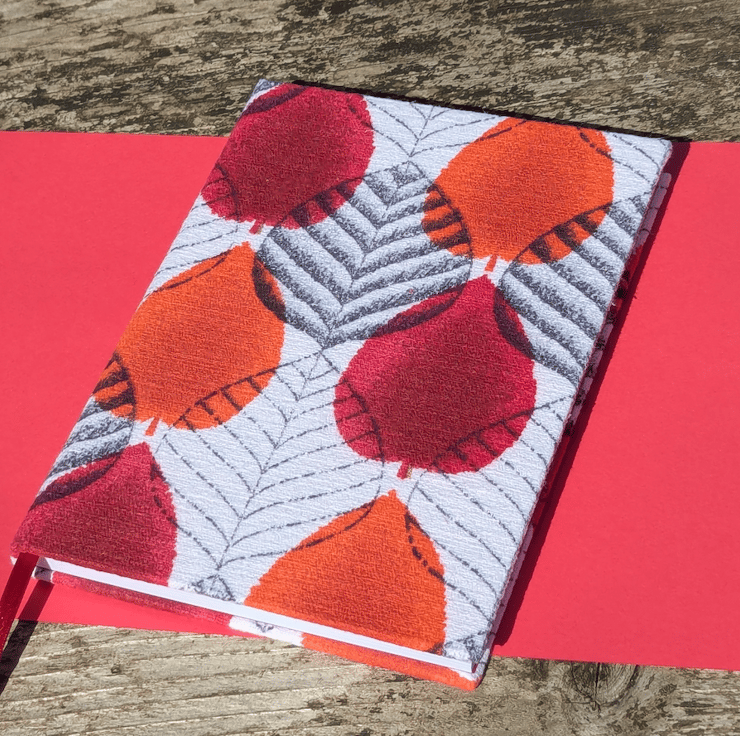 Handmade A5 Journal, 1950s Red and Orange Leaf Design Vintage Barkcloth Fabric