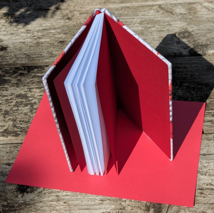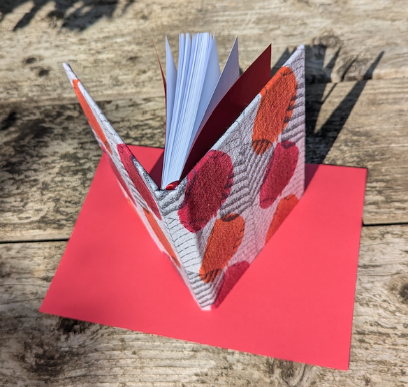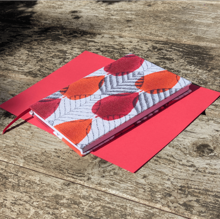 Each book I make includes a ribbon bookmark and coloured end-papers made from high quality Canford or Canson paper, hand picked to match one of the colours in the fabric design. This book has an autumnal red silk ribbon and matching Canford end papers.