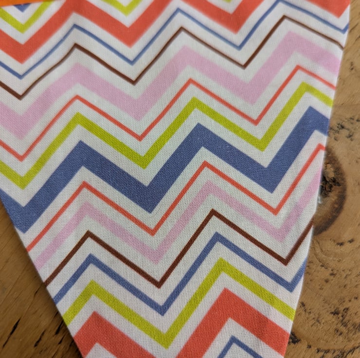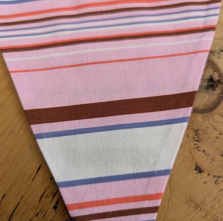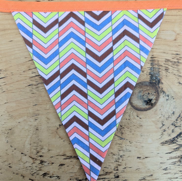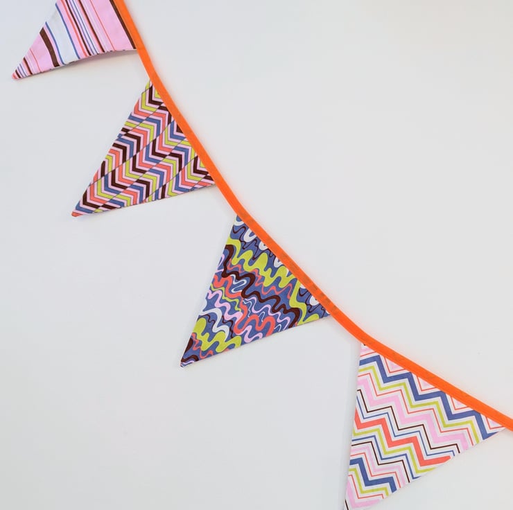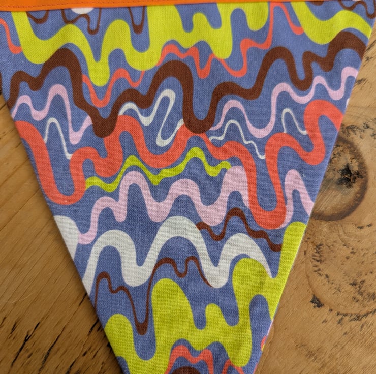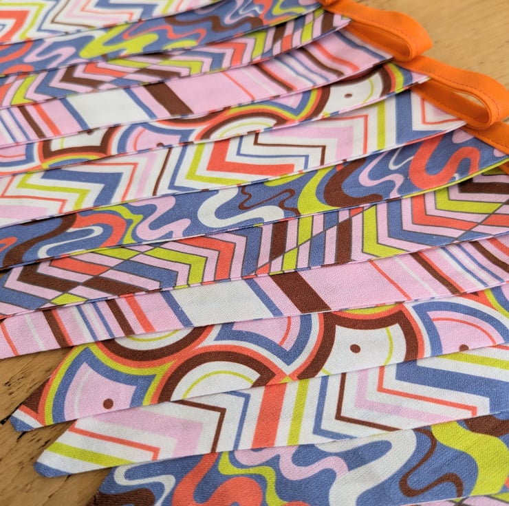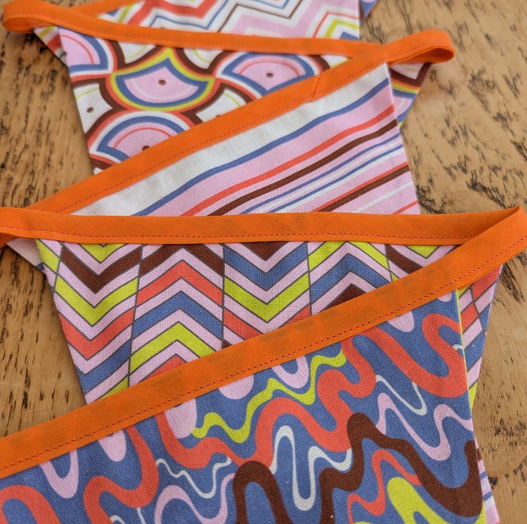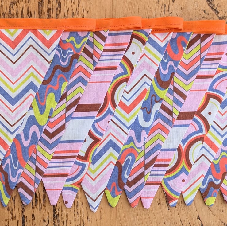 A funky retro vibe to this 3 metre bunting, carefully put together using colourful pink and purple fabric with swirls and stripes and orange bias binding.