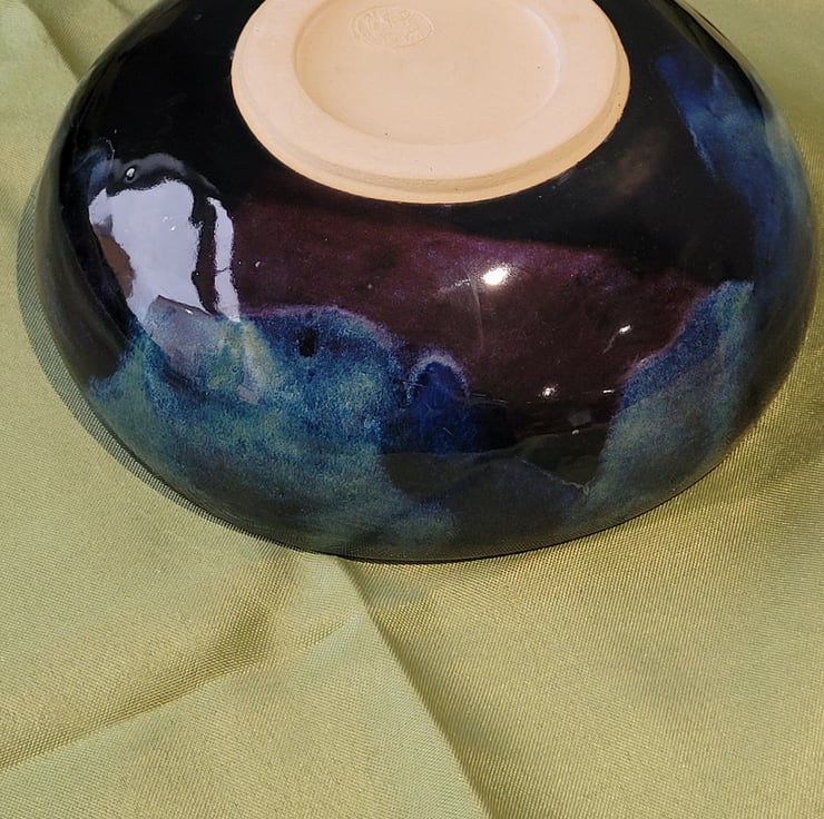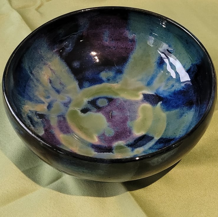 This wheel thrown decorative bowl has a black glaze on both its surfaces.. It then had layered green, blue and purple glasses used to create a northern lights style effect. This piece has a diameter of 20.5cm and a height of 8cm.
