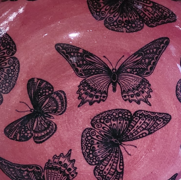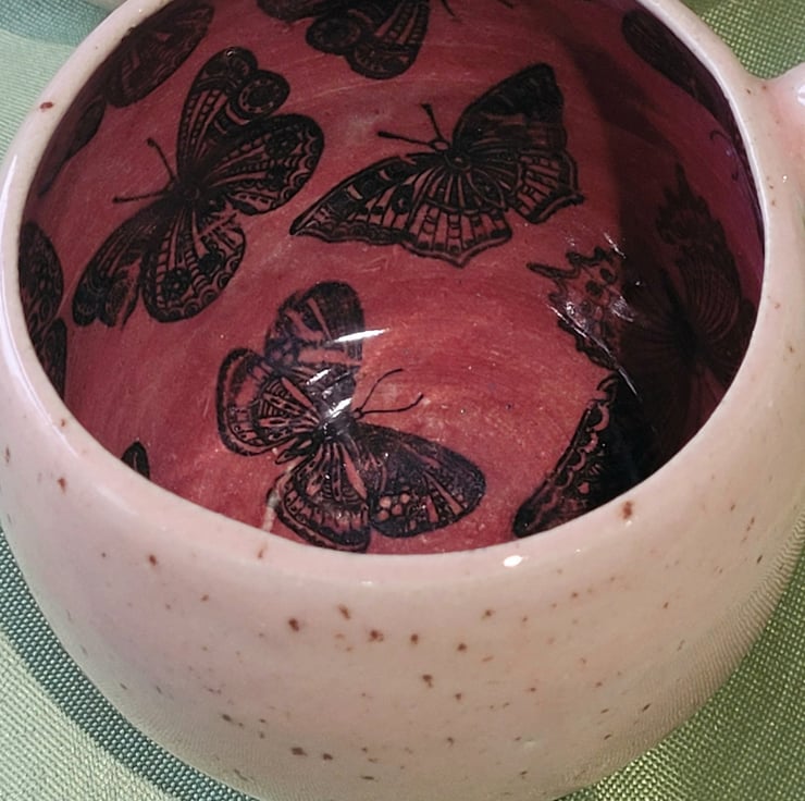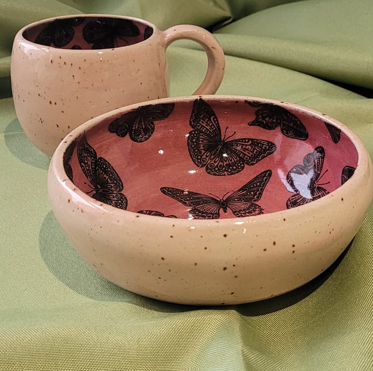 This breakfast set consists of a wheel thrown bowl and mug. Each piece has a speckled pink glaze covering it's outer surfaces and a pink glaze background with butterfly detailing on its inner surface. The bowl has a diameter of 15cm and a height of 5.5cm. The mug has a diameter of 9cm, a height of 7.5cm and a capacity of 250ml.